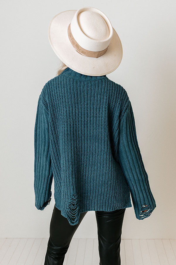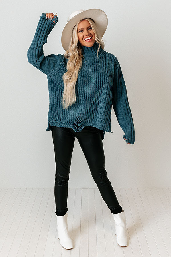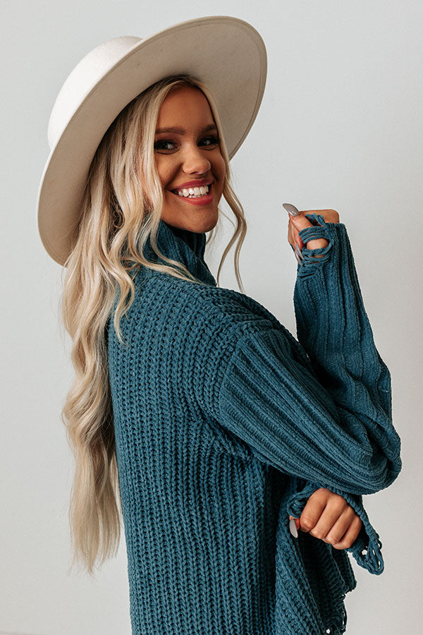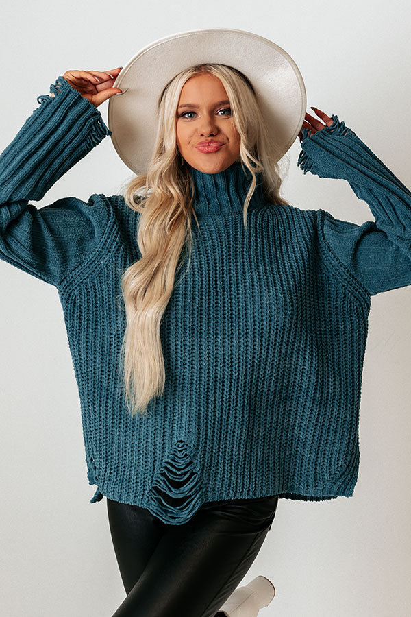 You are guaranteed to smile when you complete your look with our cute dark teal hued 'Simmering Love' sweater featuring soft knit material with thick vertical ribbed texturing, a bulky turtle neckline, long loose sleeves, distressed trim detailing, and a slouched silhouette that falls into a straight hemline!