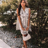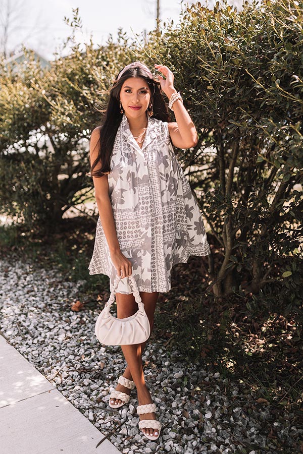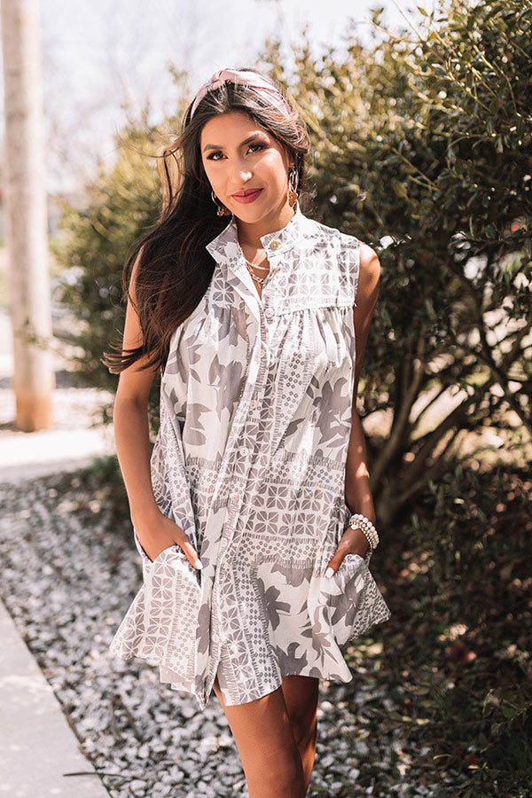 We have no doubt you will be simply content with how adorable this shift dress is featuring lightweight flowy material patterned with a grey and white floral and geometric print, a button down front with a high neckline, low hidden side pockets, wide sleeveless shoulders, and a relaxed silhouette that falls into an uneven mid-thigh length hemline! Measurements