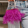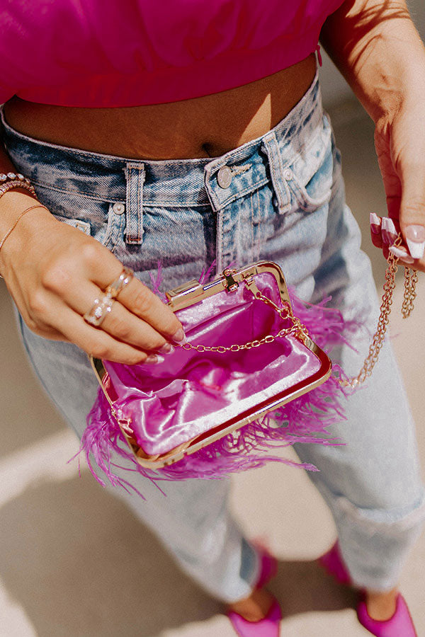 Believe us when we say this luxe clutch is simply divine with its hot pink feather detailing, pearl handle, gold chain link shoulder strap, and coin purse silhouette with a pressure snap closure!