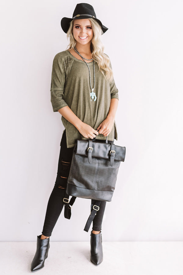 You will be "simply glowing" when you wear this martini olive shift top featuring lightweight material with subtle waffle knit texturing, heathered accent panels, a v-cut neckline, quarter length sleeves, exposed seams, and an ultra relaxed silhouette that falls into a straight hemline with side slits! We have styled this piece with some distressed black skinnies, a long statement necklace, and pointed booties, a trendy backpack, and a faux suede hat, but you can also wear it with some denim flares and "The Seraphina Faux Leather Wedge in Grey!" Measurements