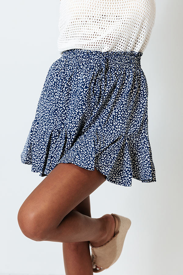 We have no doubt you will simply look gorgeous when you complete your look with these adorable blue short featuring lightweight flowy material patterned with a cute leopard print, a small leopard print, an elastic waistline, and a flirty shift silhouette that falls into ruffled upper-thigh length hemlines! Measurements