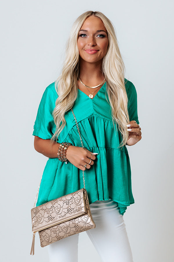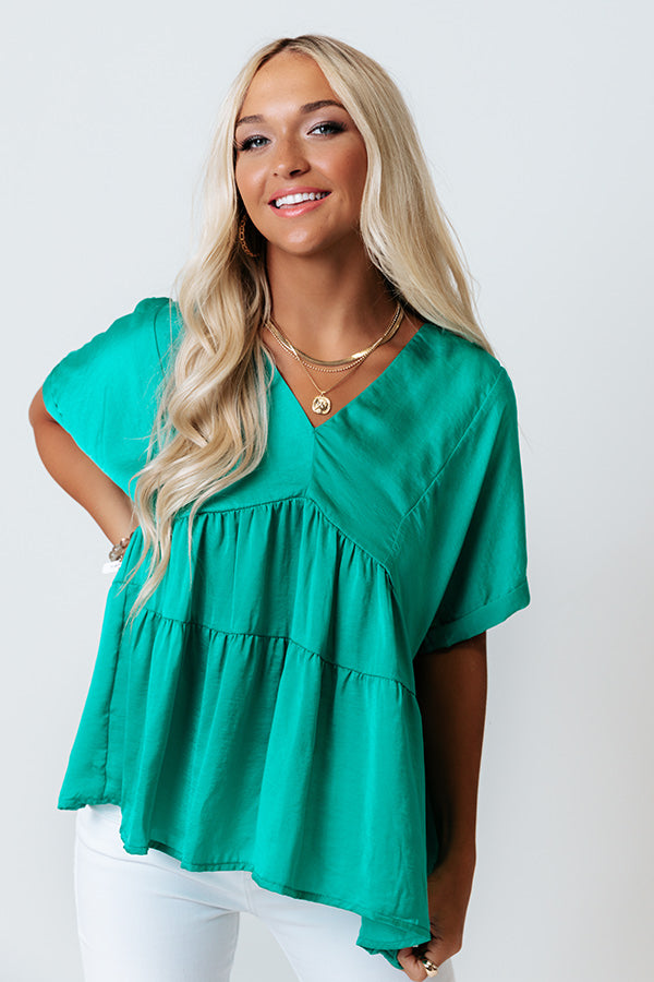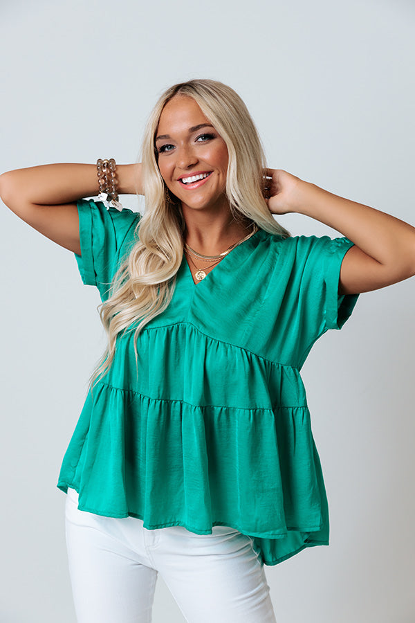 We have no doubt you will simply look gorgeous when you complete your look with this adorable jade hued top featuring lightweight satin material, a v-cut neckline and upper back with a tie closure, loose short sleeves, and a tiered babydoll silhouette that falls into an uneven hemline! Measurements