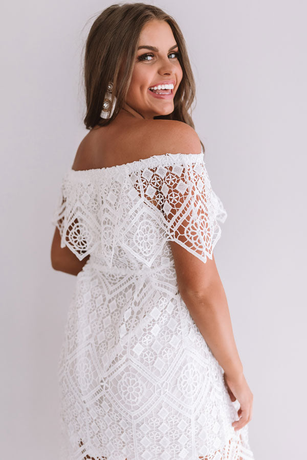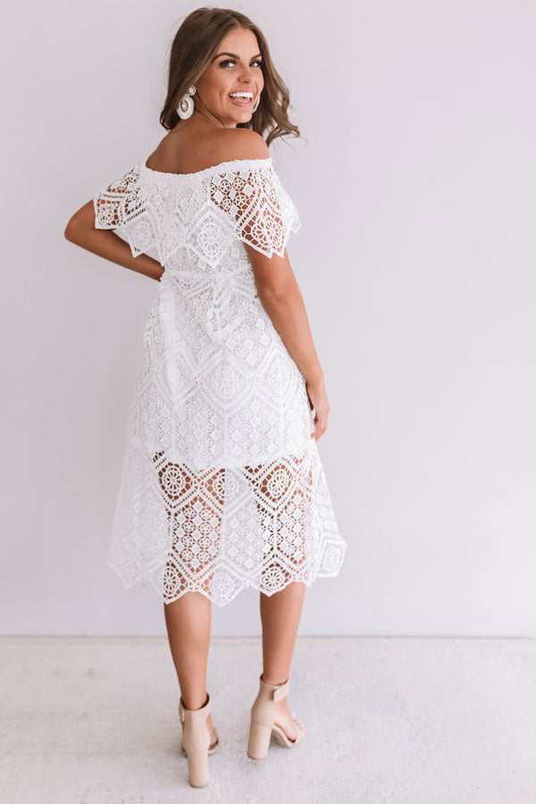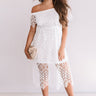 You will be simply irresistible in this white midi with its off-shoulder fit and extended crochet layer! Style with simple nude heels and an elegant clutch for a look that you will want to wear to every black tie event this summer! Measurements