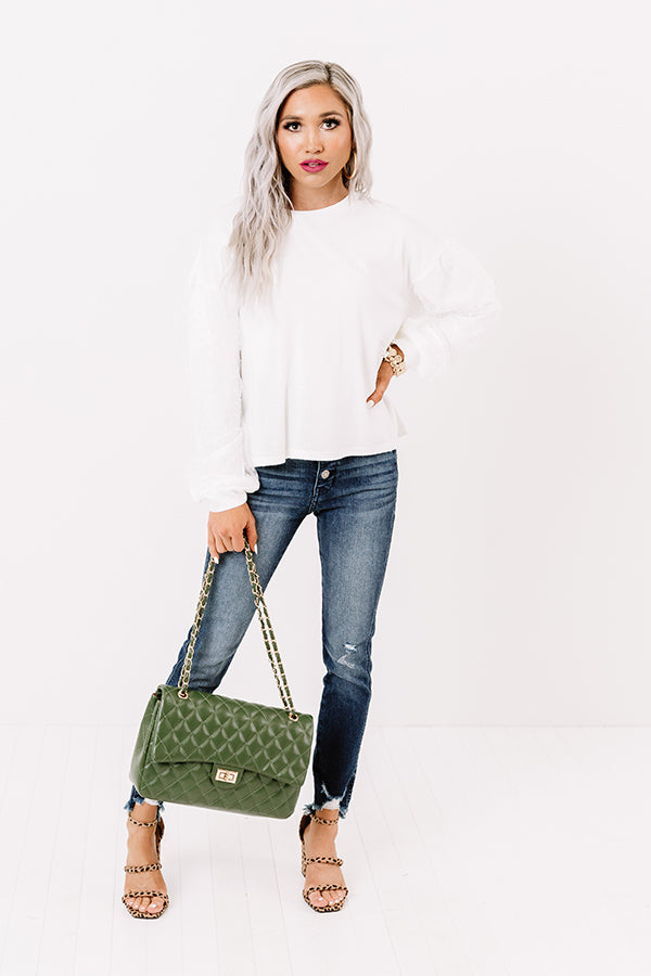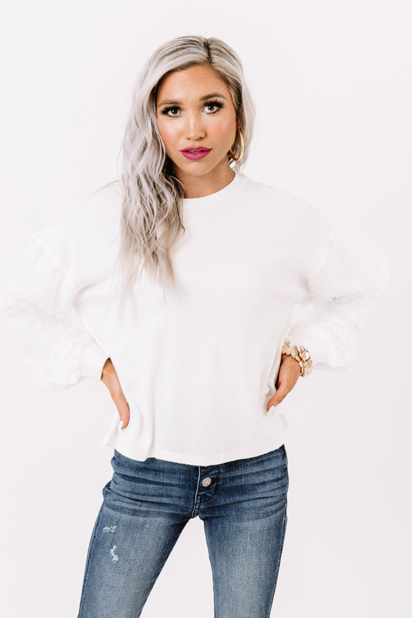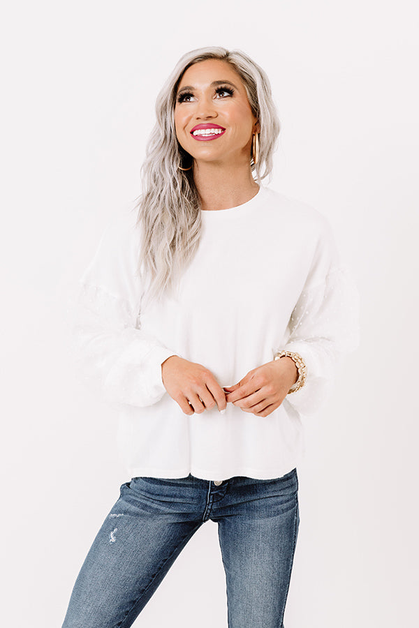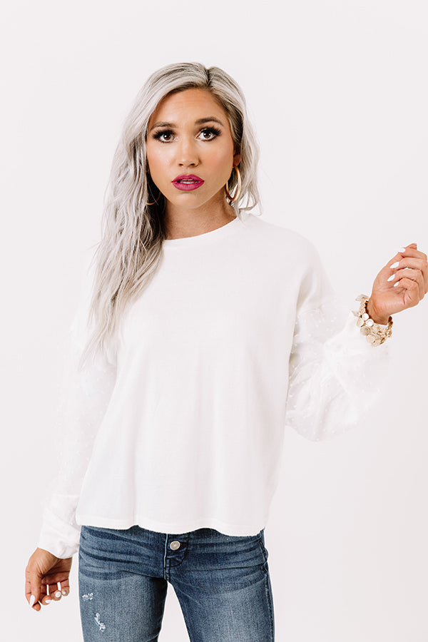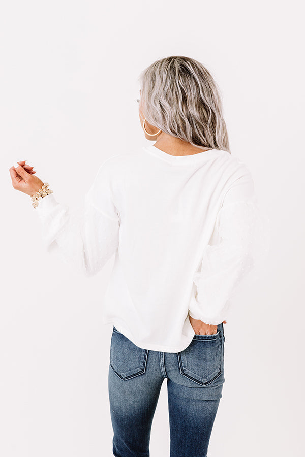 You will be simply joyful when you complete your look with this charming white sweater top featuring soft lightweight tight knit material, a high rounded neckline, long bubble sleeves with fitted cuffs and subtle polka dot texturing, and a relaxed silhouette that falls into an uneven hemline!