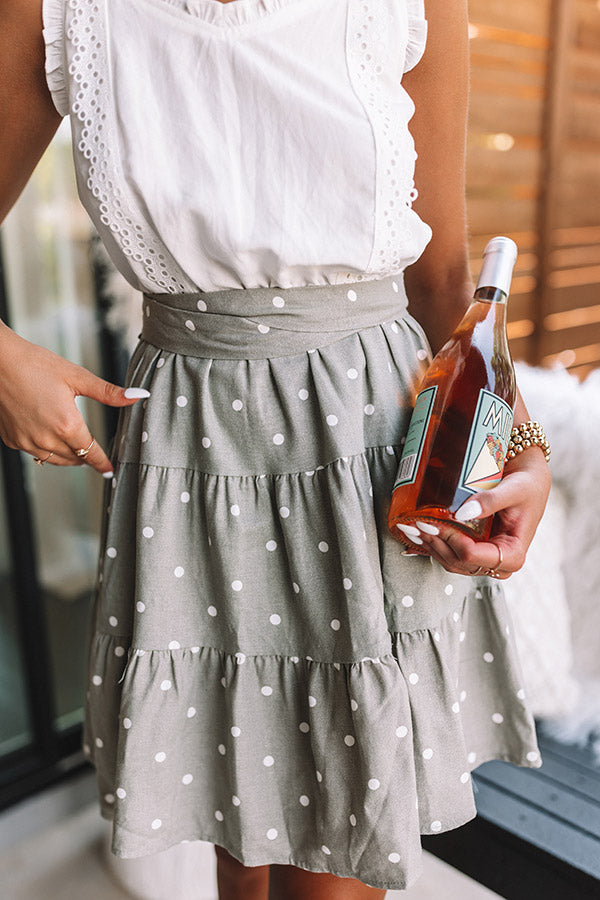 We have no doubt you will look simply radiant in this darling dress featuring a lightweight white tank silhouette with a v-cut neckline, crochet detailing, and adjustable spaghetti straps, and a pear colored skirt patterned with white polka dots, a tie belt, and a tiered silhouette that falls into a straight mid-thigh length hemline! Measurements