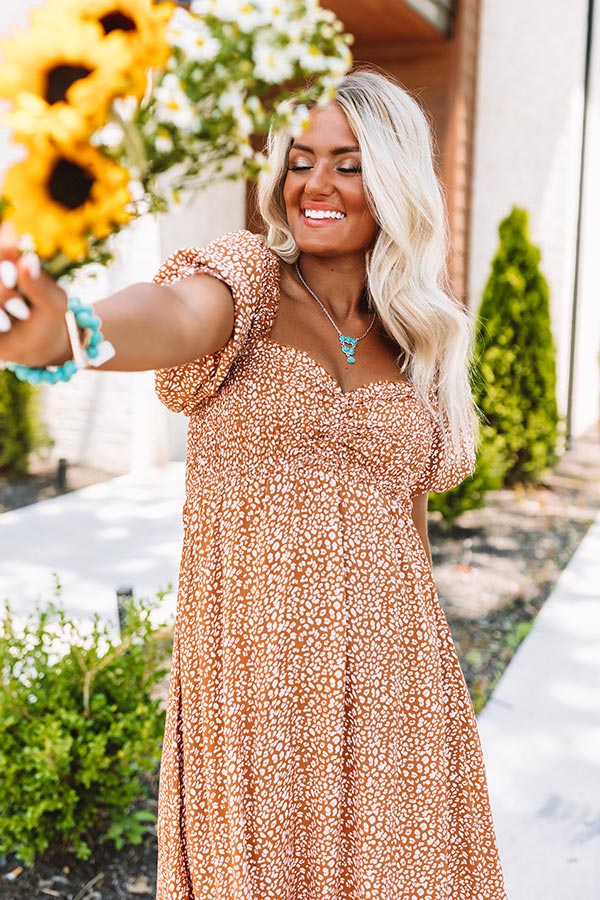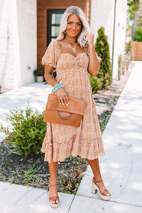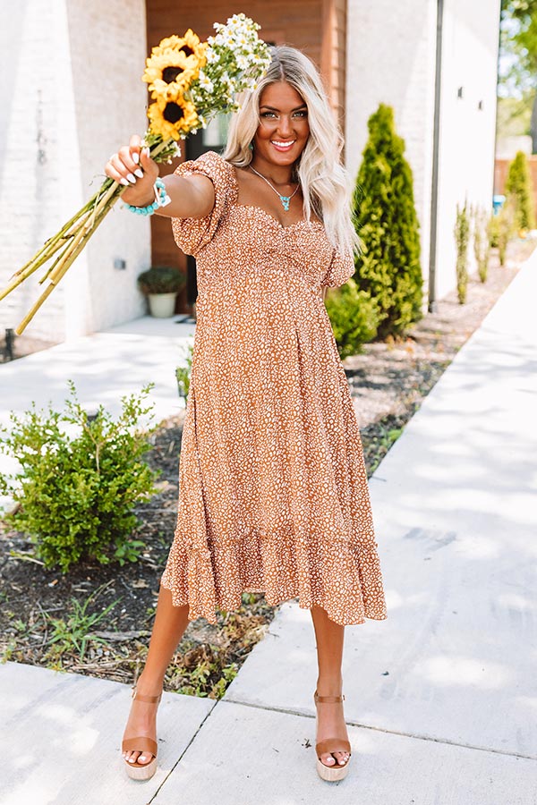 We have no doubt you will look simply radiant in this beautiful camel colored midi dress featuring lightweight flowy material patterned with a small white print, a sweetheart neckline with a flirty ruched bodice, short bubble sleeves, a square upper back with smocked detailing, and a relaxed skirt silhouette that falls into a ruffled mid-calf length hemline! Measurements
