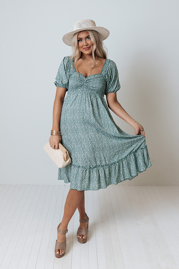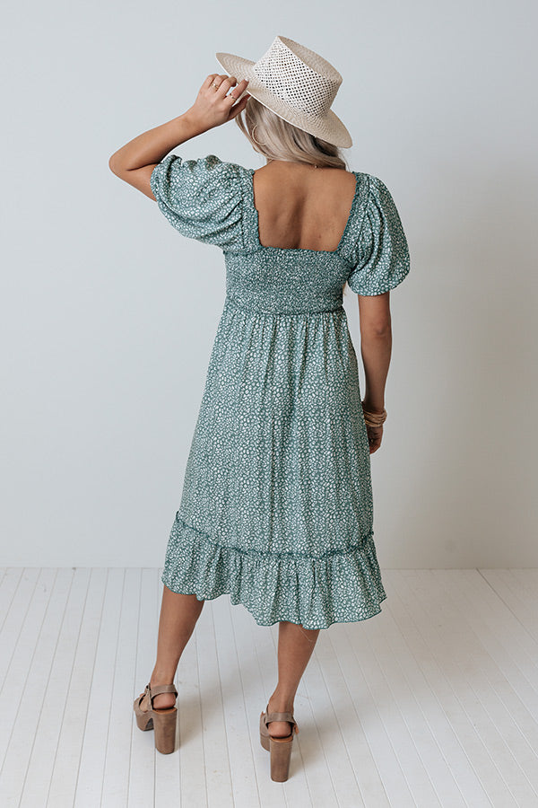 We have no doubt you will look simply radiant in this beautiful dark pear colored midi dress featuring lightweight flowy material patterned with a small white print, a sweetheart neckline with a flirty ruched bodice, short bubble sleeves, a square upper back with smocked detailing, and a relaxed skirt silhouette that falls into a ruffled mid-calf length hemline! Measurements