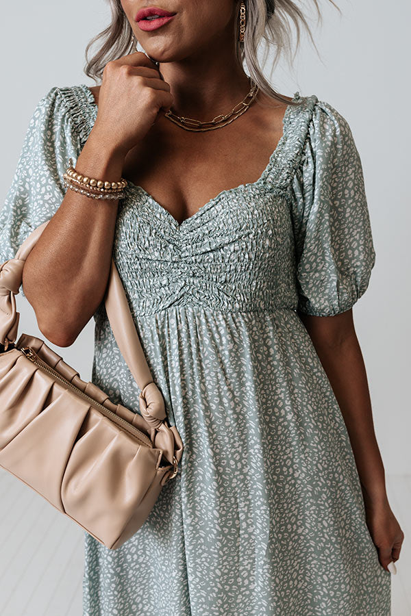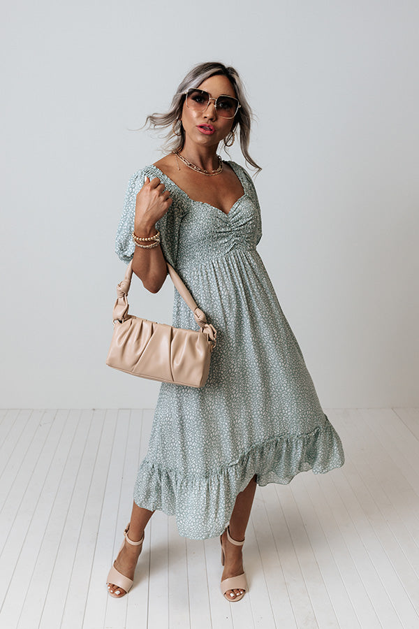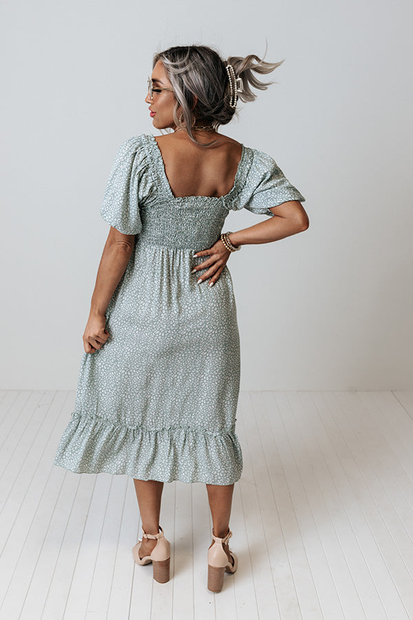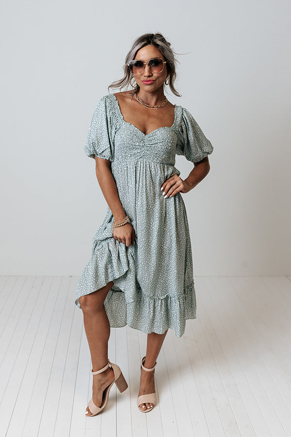 We have no doubt you will look simply radiant in this beautiful sage colored midi dress featuring lightweight flowy material patterned with a small white print, a sweetheart neckline with a flirty ruched bodice, short bubble sleeves, a square upper back with smocked detailing, and a relaxed skirt silhouette that falls into a ruffled mid-calf length hemline! Measurements