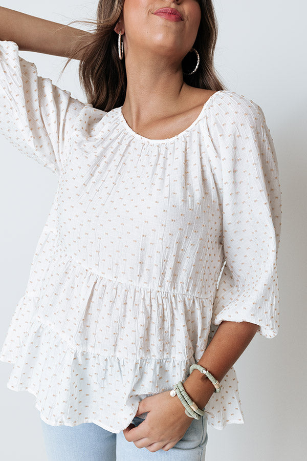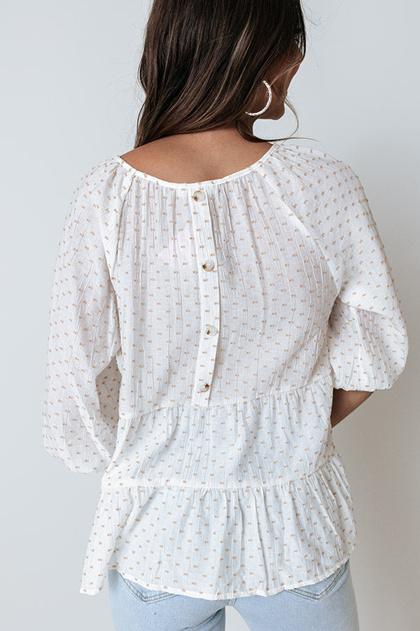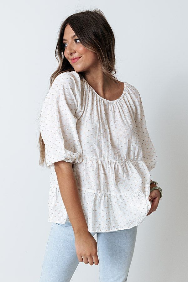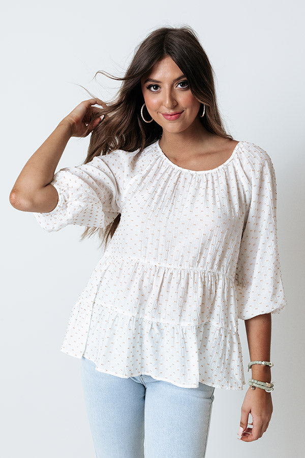 Effortlessly get ready in our charming ivory colored 'Simply Serene Shift Top' featuring lightweight flowy material patterned with polka dot texturing, a scooped neckline, bubble half sleeves, a four button closure back, and a relaxed tiered silhouette that fall into an uneven hemline! Measurements
