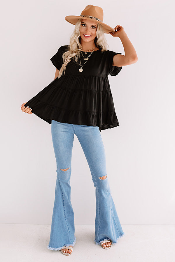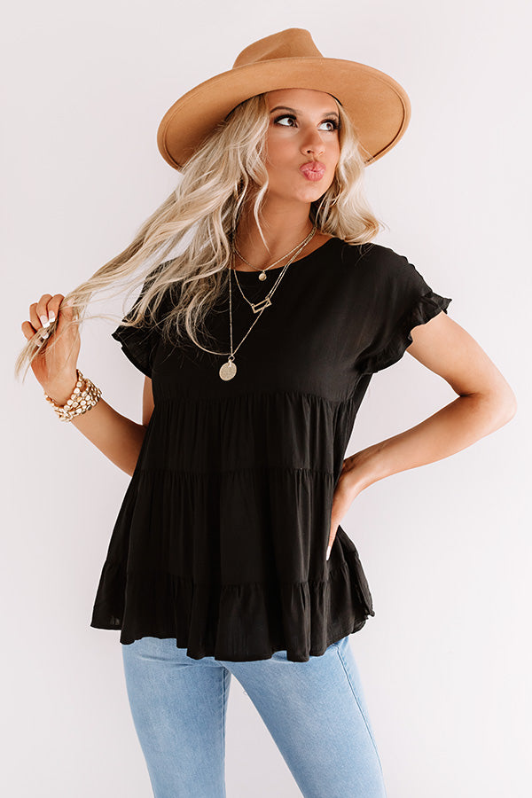 Our black "Simply Southern" top is simple but significant with its lightweight breezy material, a high rounded neckline, short loose sleeves with ruffled trim detailing, a keyhole accented upper back with a button closure, and a relaxed tiered babydoll silhouette that falls into an uneven hemline! You can style this classy piece a variety of ways, like with some distressed light wash flares and a snake print mule heel and neutral faux suede hat, but you can also wear it some frayed white shorts, our black and white "Rory Sandal," and our black and white striped "Keep It Beachy Canvas Tote!" Measurements