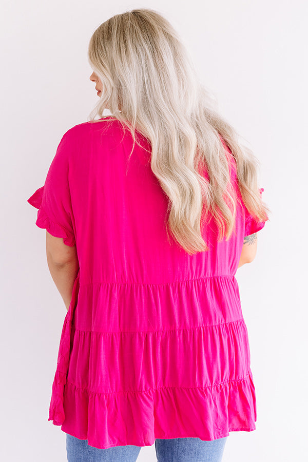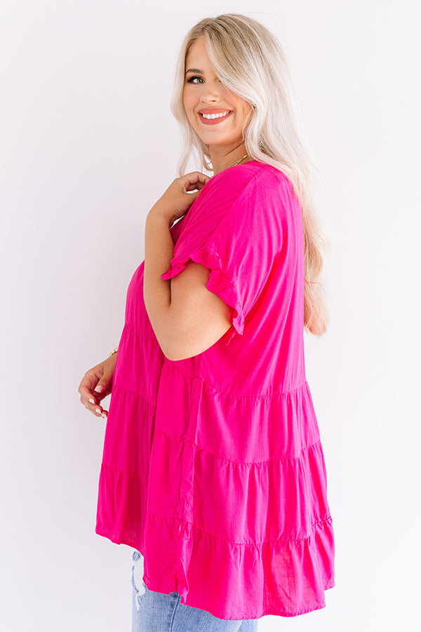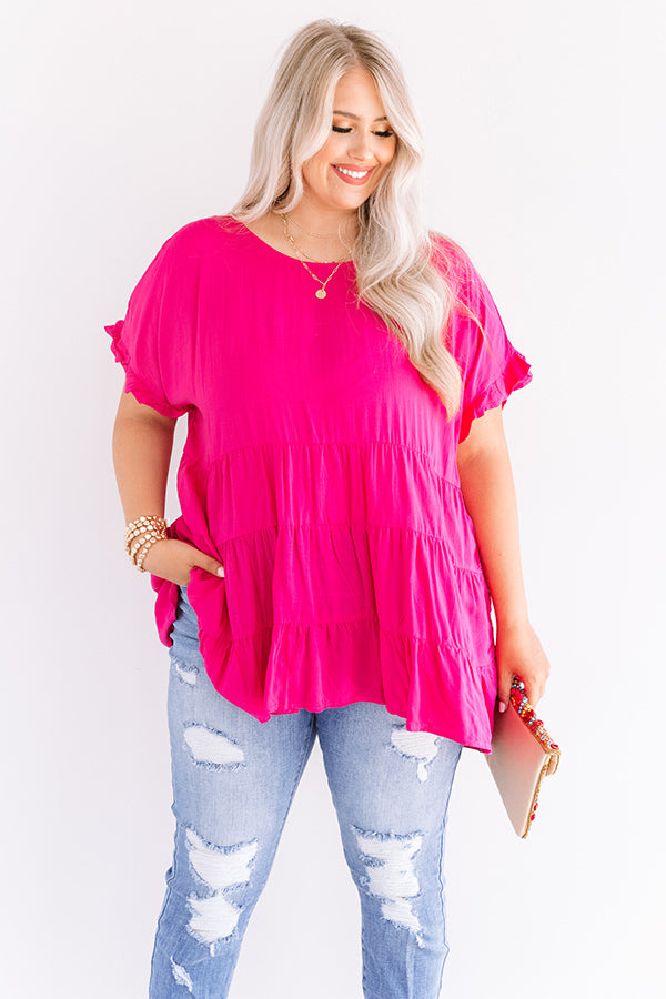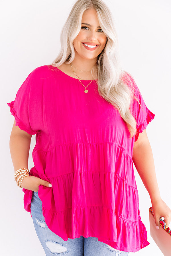 Plus Size - Our hot pink "Simply Southern" top is simple but significant with its lightweight breezy material, a high rounded neckline, short loose sleeves with ruffled trim detailing, a keyhole accented upper back with a button closure, and a relaxed tiered babydoll silhouette that falls into an uneven hemline! You can style this classy piece a variety of ways, like with some distressed light wash flares, neutral mule heels, and a matching beaded clutch, or it can be worn with some frayed black shorts, "The Roxana Lace Up Wedge in Hot Pink," and our woven "Tropical Occasion Hat!"