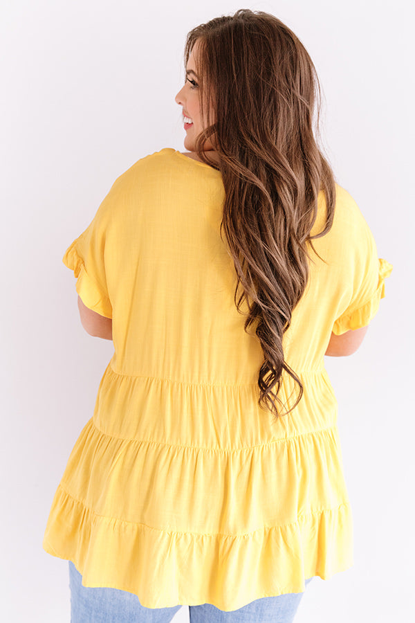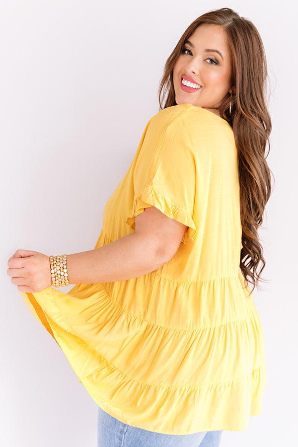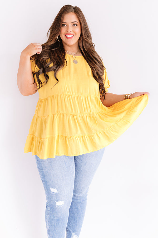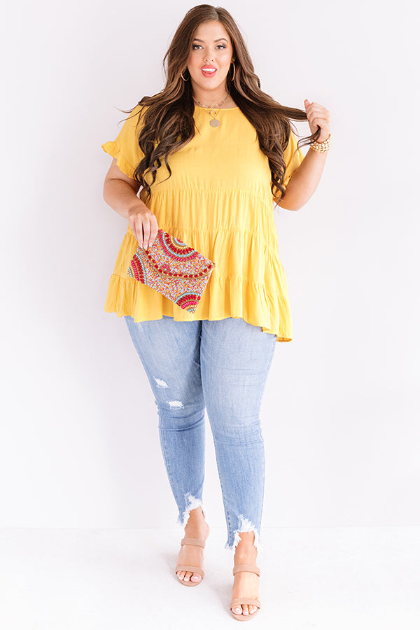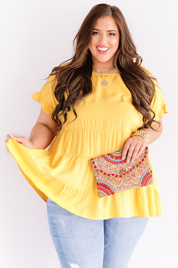 Plus Size - Our marigold colored "Simply Southern" top is simple but significant with its lightweight breezy material, a high rounded neckline, short loose sleeves with ruffled trim detailing, a keyhole accented upper back with a button closure, and a relaxed tiered babydoll silhouette that falls into an uneven hemline! You can style this classy piece a variety of ways, like with some distressed light wash skinnies, a matching clutch, and neutral mule heels, but you can also wear it some frayed white shorts, "The Brighton Espadrille in Yellow," and our "Sippin' At Sunset Sunnies in White!" Measurements