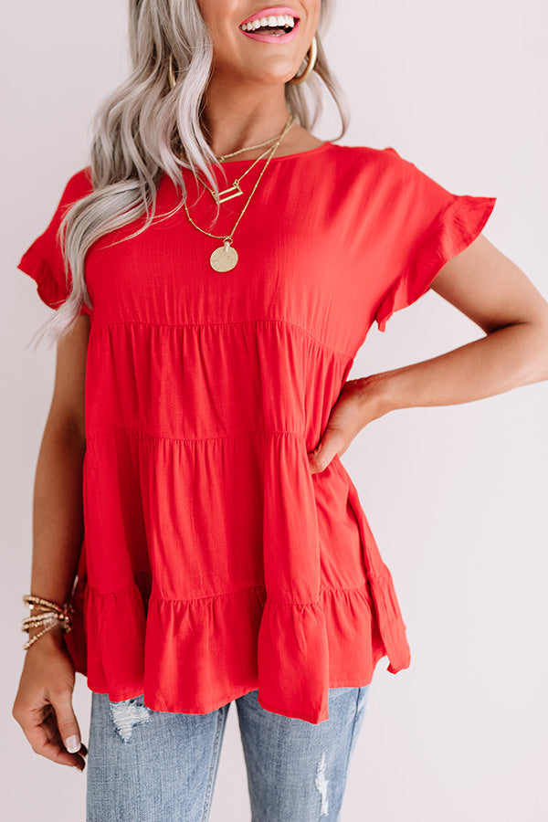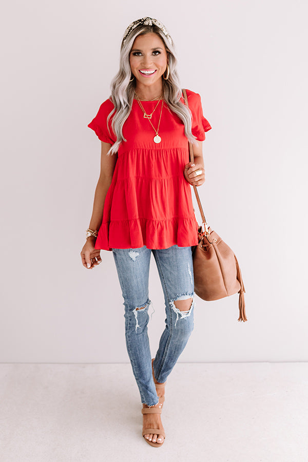 Our red hot "Simply Southern" top is simple but significant with its lightweight breezy material, a high rounded neckline, short loose sleeves with ruffled trim detailing, a keyhole accented upper back with a button closure, and a relaxed tiered babydoll silhouette that falls into an uneven hemline! You can style this classy piece a variety of ways, like with some distressed ankle skinnies, a statement headband, and a brow mule heel and bucket bag, but you can also wear it some frayed white shorts and "The Lyla Sandal in Red!" Measurements
