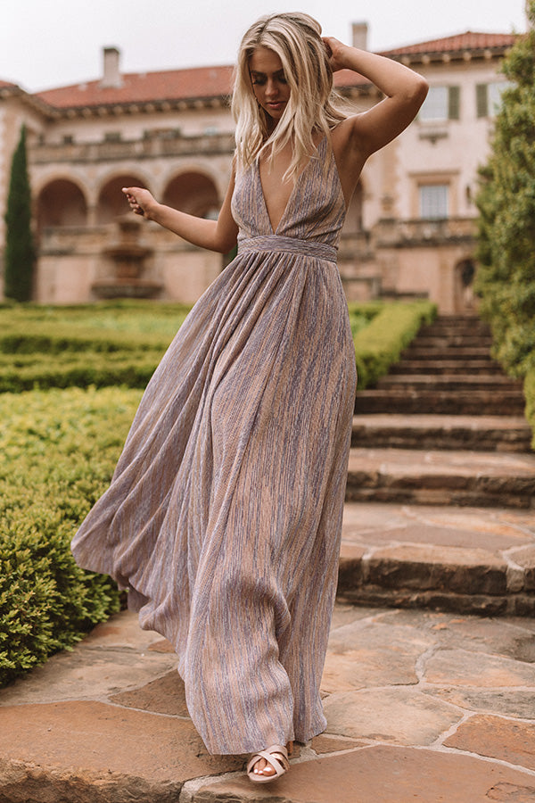 This luxurious maxi embodies elegance with its deep v-neck and metallic accents! The low back is open except for the adjustable, criss crossed spaghetti straps and the zipper that goes up to the waistline. There is no doubt people will stop and stare when you wear this stunning dress, especially when you style it with our "Casual Elegance Clutch in Royal Plum" and "The Smolder Metallic Heel!"