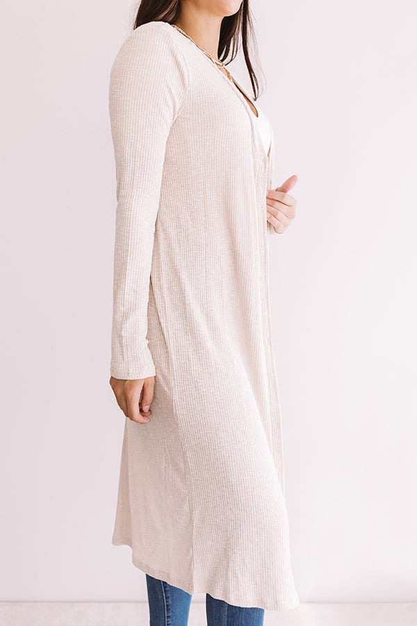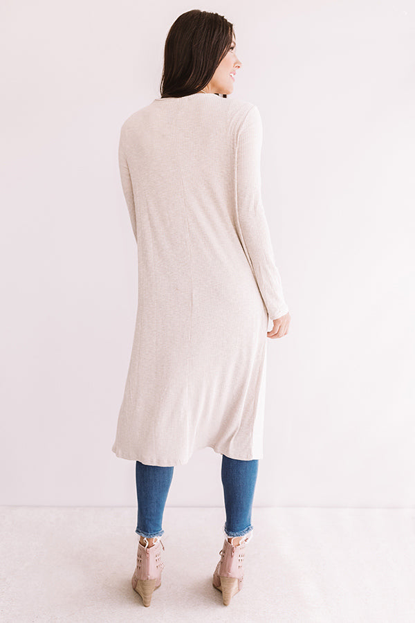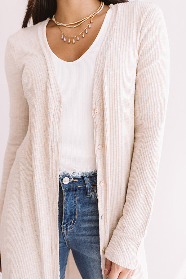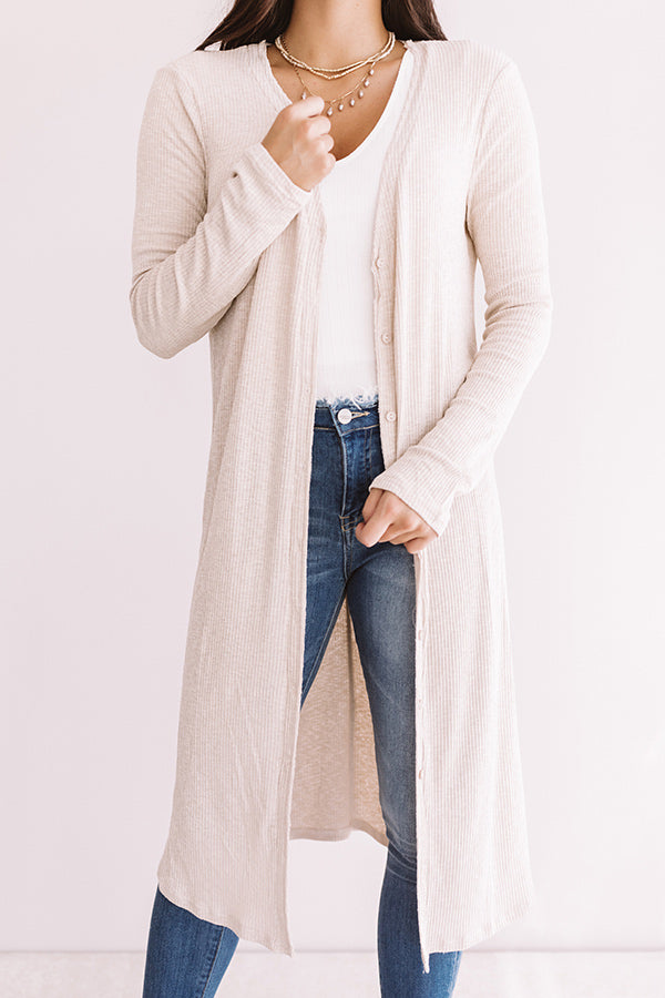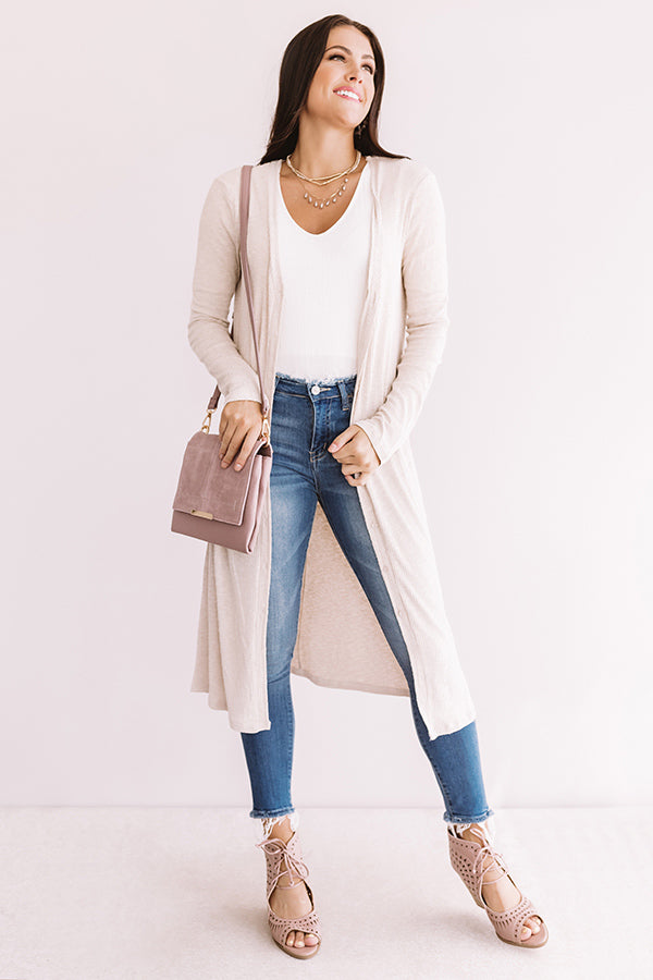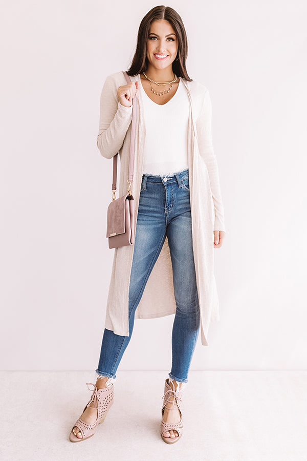 You will be 'simply swept away" when you wear this birch cardigan featuring a tight knit lightweight material, a subtle ribbed texture, long fitted sleeves that can be rolled, a calf-length straight hemline, and an open front silhouette that can also be buttoned up! You can style this versatile transitional piece with just about anything from a basic tank to a sweater, jeans to dresses, booties to sandals, clutches to totes, and hats to earrings! Here we have styled it over a basic white bodysuit with some distressed jeans and a neutral peep toe bootie! Measurements