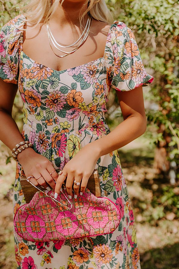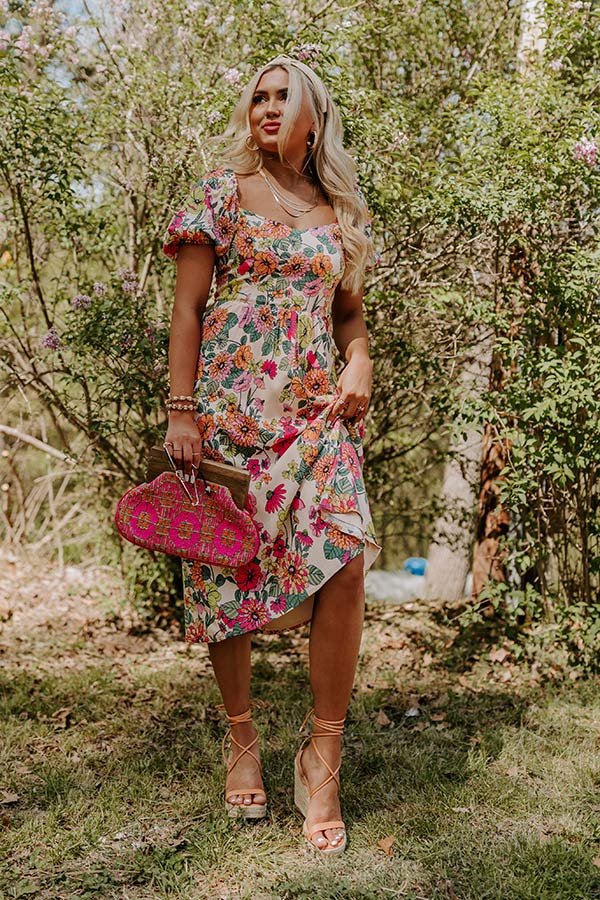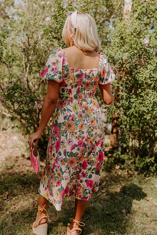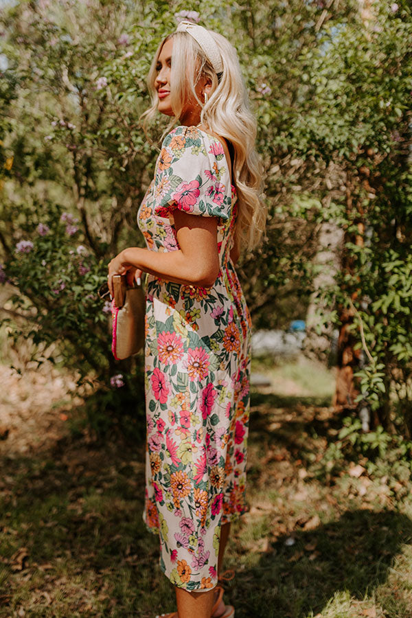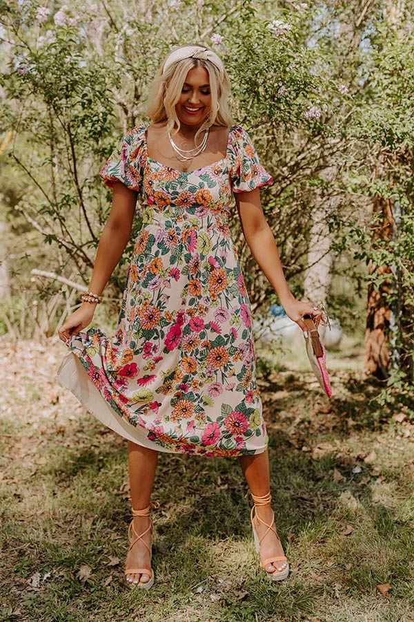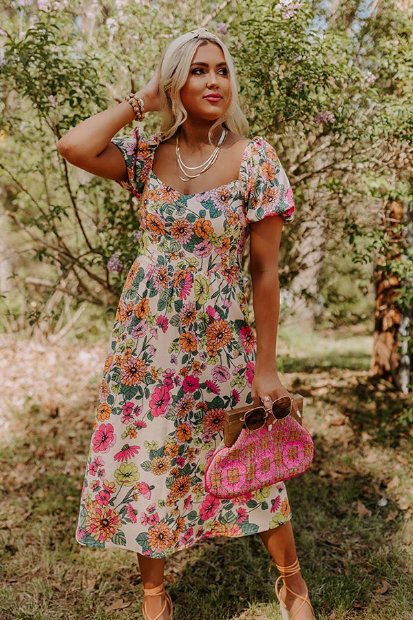 You will be simply unforgettable when you arrive in this stunning peach colored midi dress featuring lightweight material patterned with a bold orange, yellow, hot pink, light pink, and green floral print, a scooped neckline, short puff sleeves, a flattering smocked back bodice with a zip closure, and a relaxed skirt silhouette that falls into a straight mid-calf length hemline! on products