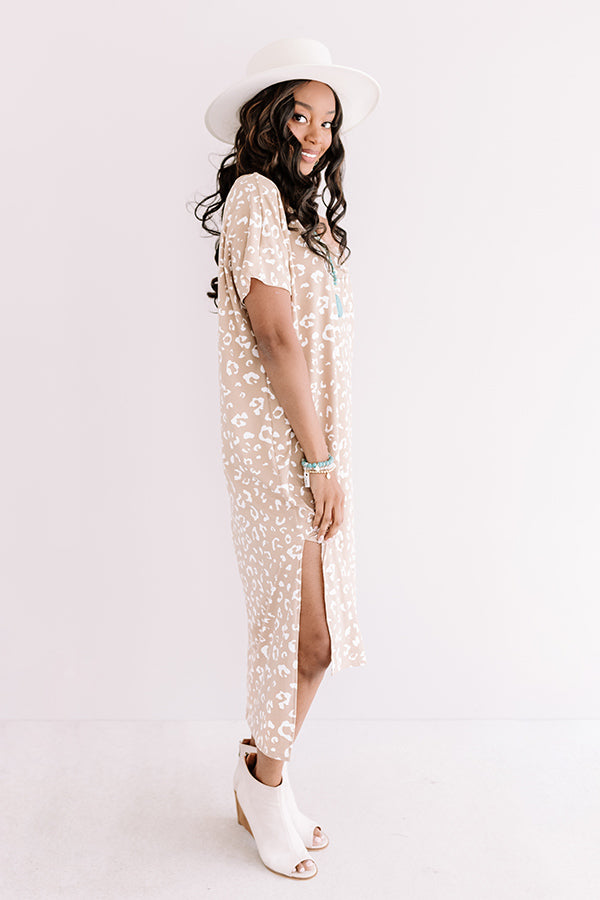 Stun the crowd with our stunning neutral hued "Sincerely Chic" midi dress featuring lightweight material with a white leopard print, a high rounded neckline, short loose sleeves, and an ultra relaxed silhouette that falls into a straight high/low mid-calf length hemline with accent side slits! We have styled this gorgeous piece with some turquoise statement jewelry and a white wedged bootie, crossbody, and faux suede hat, but you can also wear it layered under a cropped jean jacket with our white "Flake Slip On Sneaker!" Measurements