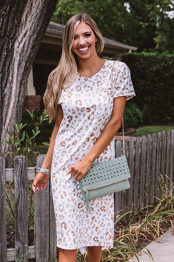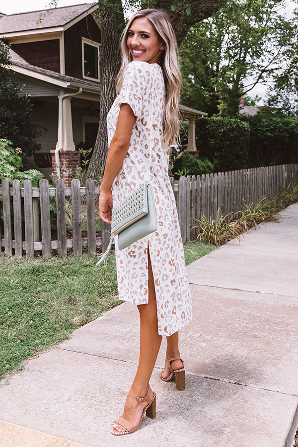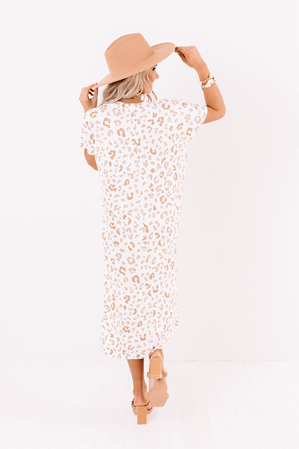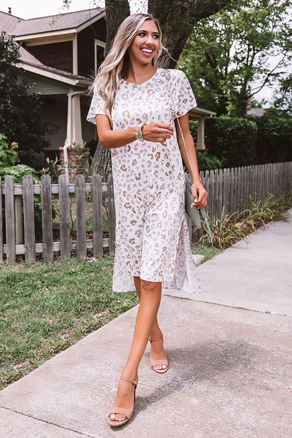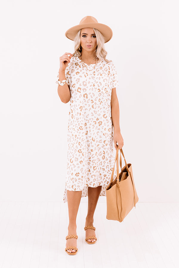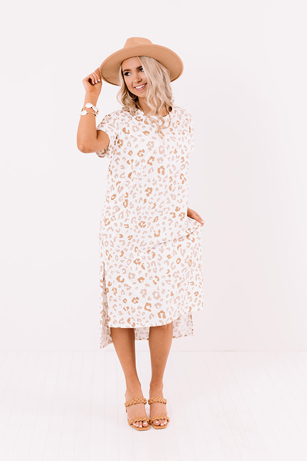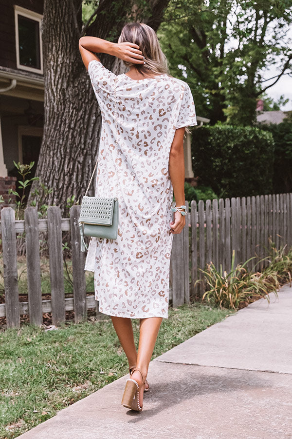 Stun the crowd with our stunning ivory hued 'Sincerely Chic' midi dress featuring lightweight material with a neutral leopard print, a high rounded neckline, short loose sleeves, and an ultra relaxed silhouette that falls into a straight high/low mid-calf length hemline with accent side slits! Measurements
