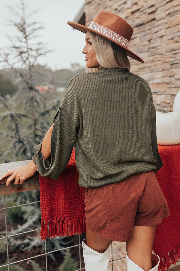 Perfect for wearing solo or layered under a jacket, our versatile olive colored 'Singing Along' top features lightweight material with subtle ribbed texturing, a rounded neckline, long loose sleeves with fitted cuffs and cutout elbow and forearm accents, and a slouched silhouette that falls into a straight hemline!