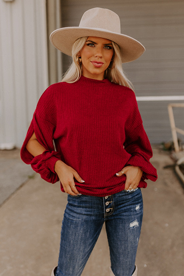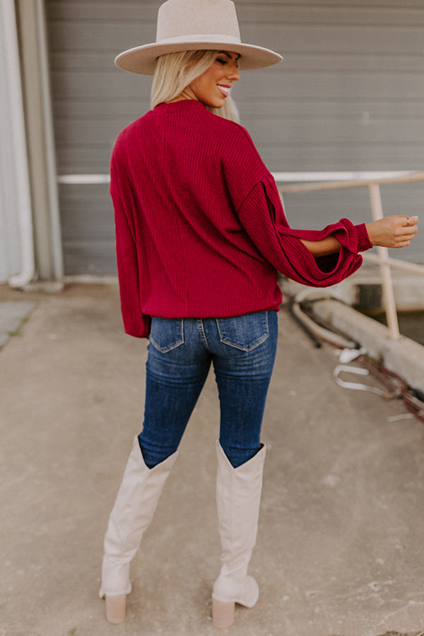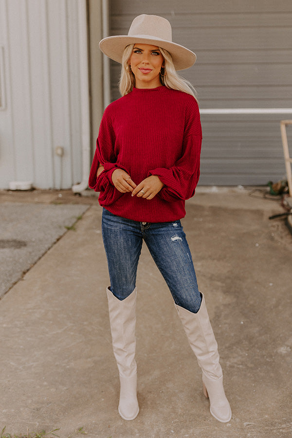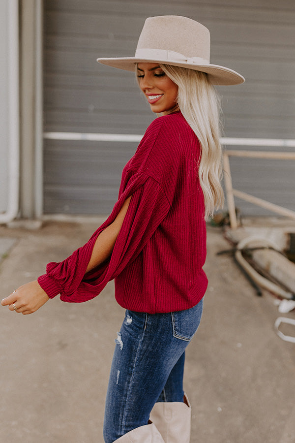 Perfect for wearing solo or layered under a jacket, our versatile wine colored 'Singing Along' top features lightweight material with subtle ribbed texturing, a rounded neckline, long loose sleeves with fitted cuffs and cutout elbow and forearm accents, and a slouched silhouette that falls into a straight hemline!