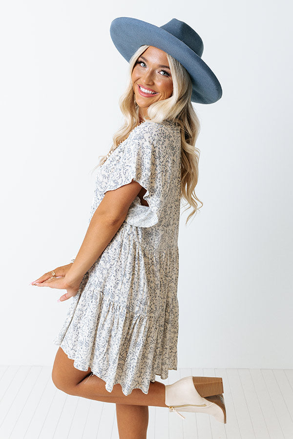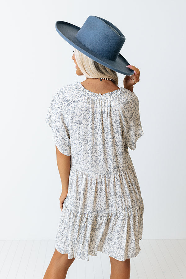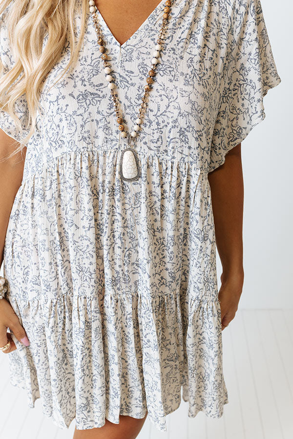 Sip a cocktail by the seaside in style with this adorable ivory colored dress featuring lightweight material patterned with a large intricate blue diamond floral print, a v-cut neckline, short sleeves, and a relaxed babydoll silhouette that falls into a straight mid-thigh length hemline!