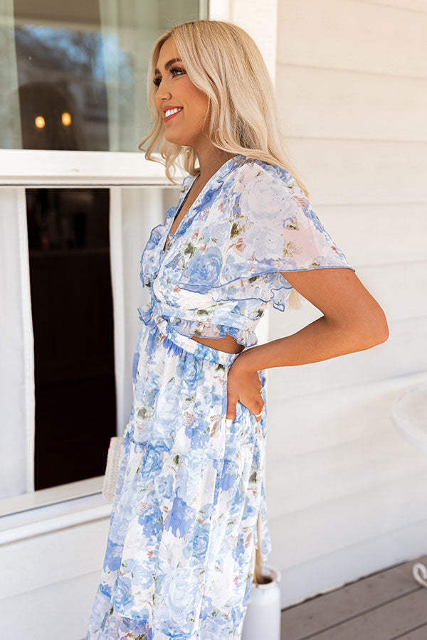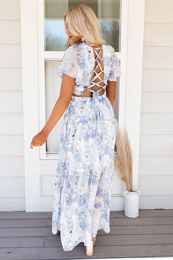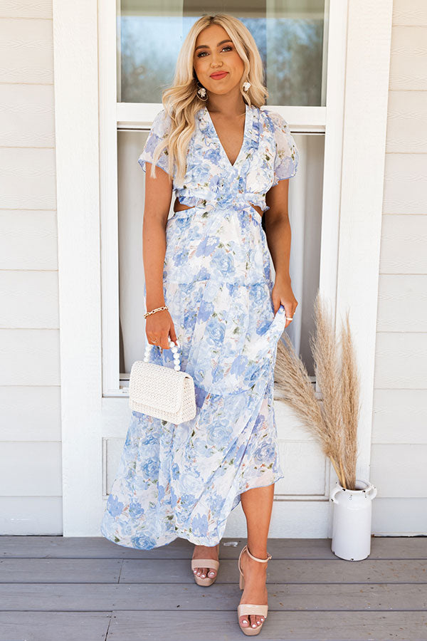 It's all business in the front and party in the back with our striking 'Sippin' And Seas' maxi dress featuring lightweight breezy material patterned with a light blue and green floral print, a v-cut neckline, short loose sleeves, side midriff cutouts, a flattering lace-up back, and a relaxed skirt silhouette that cascades into a straight ankle-length hemline!