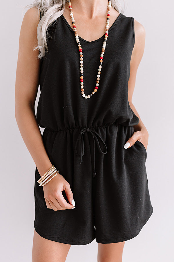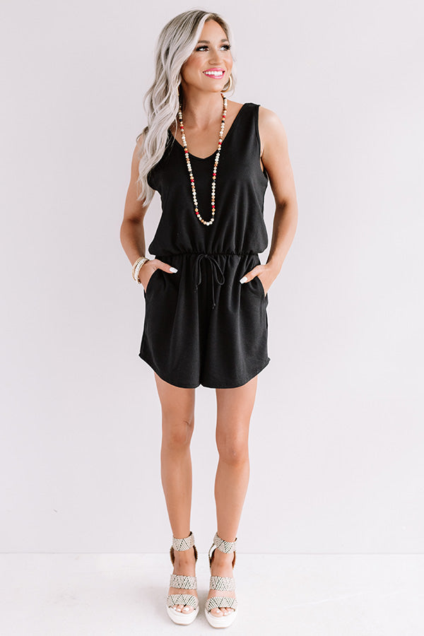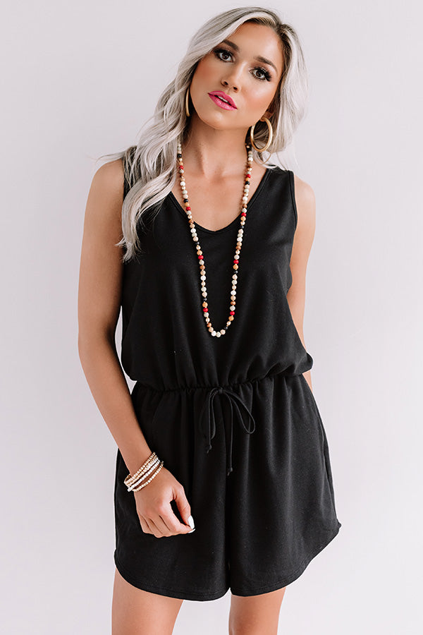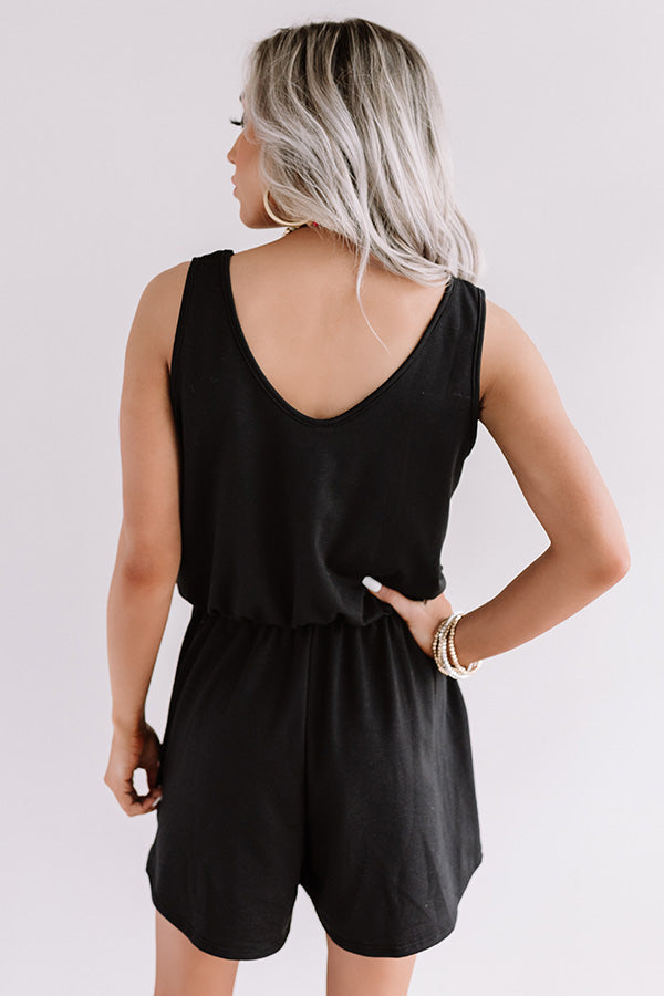 There is no better piece to wear while "sipping cocktails at sunset" than this adorable black romper featuring soft lightweight material, a v-cut neckline and upper back, wide 3-inch shoulder straps, a cinched waistline with a tie belt closure, accent side pockets, and a relaxed silhouette that falls into rounded upper-thigh length hemlines! We have styled this cutie with some patterned wedges and a long statement necklace, but you can also keep it casual when you wear it layered under a distressed denim jacket with "The Amelia Leopard Sneaker," a faux leather backpack, and a matching leopard headband! Measurements