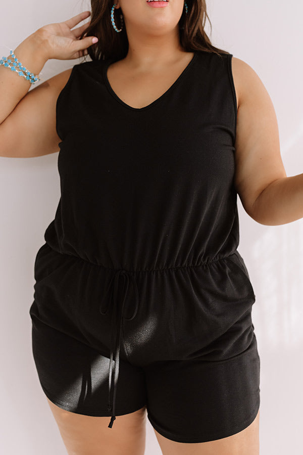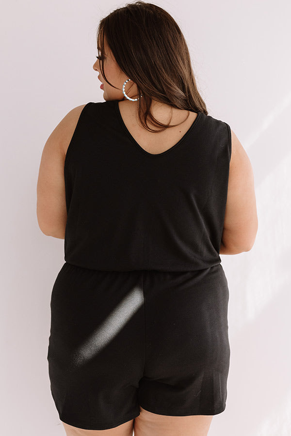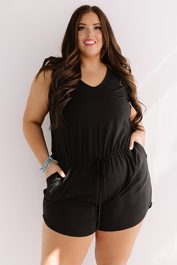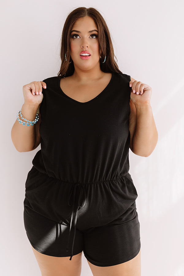 Plus Size - There is no better piece to wear while "sipping cocktails at sunset" than this adorable black romper featuring soft lightweight material, a v-cut neckline and upper back, wide 3-inch shoulder straps, a cinched waistline with a tie belt closure, accent side pockets, and a relaxed silhouette that falls into rounded upper-thigh length hemlines! We have styled this cutie with some trendy wedges and a neutral crossbody, but you can also keep it casual when you wear it layered under a distressed denim jacket with "The Amelia Leopard Sneaker!" Measurements