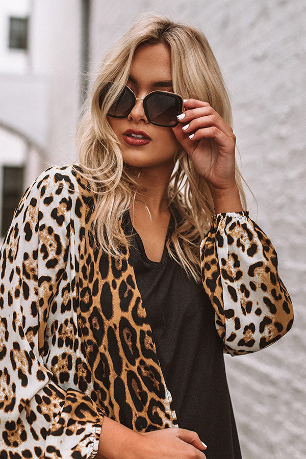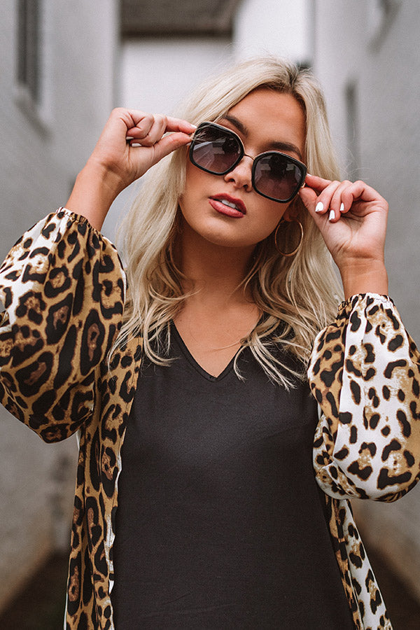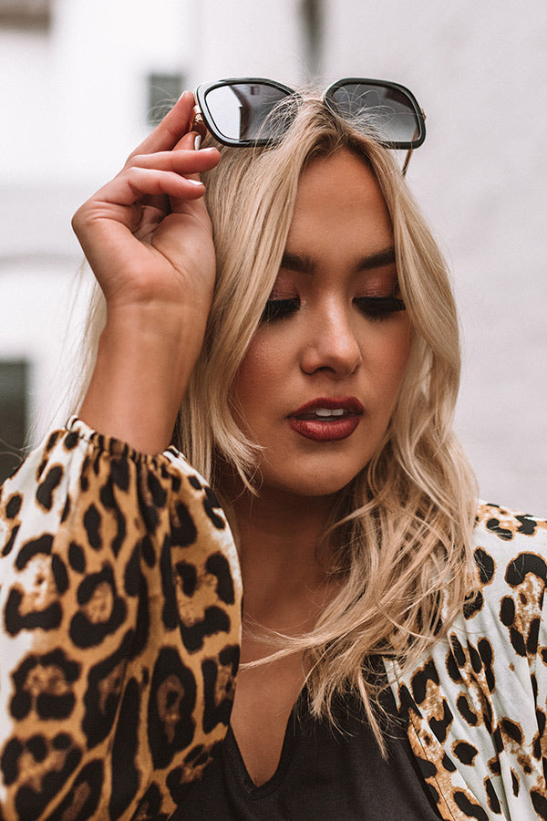 There is no better way to stay stylish while "sipping a cocktail in the shade" than by accessorizing with these adorable sunnies featuring square black frames, gold detailing on the nose bridge and ear pieces, and dark tinted lenses!