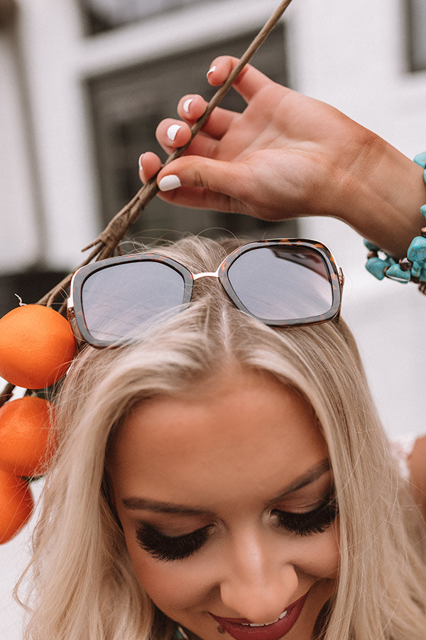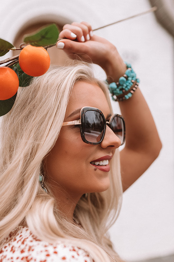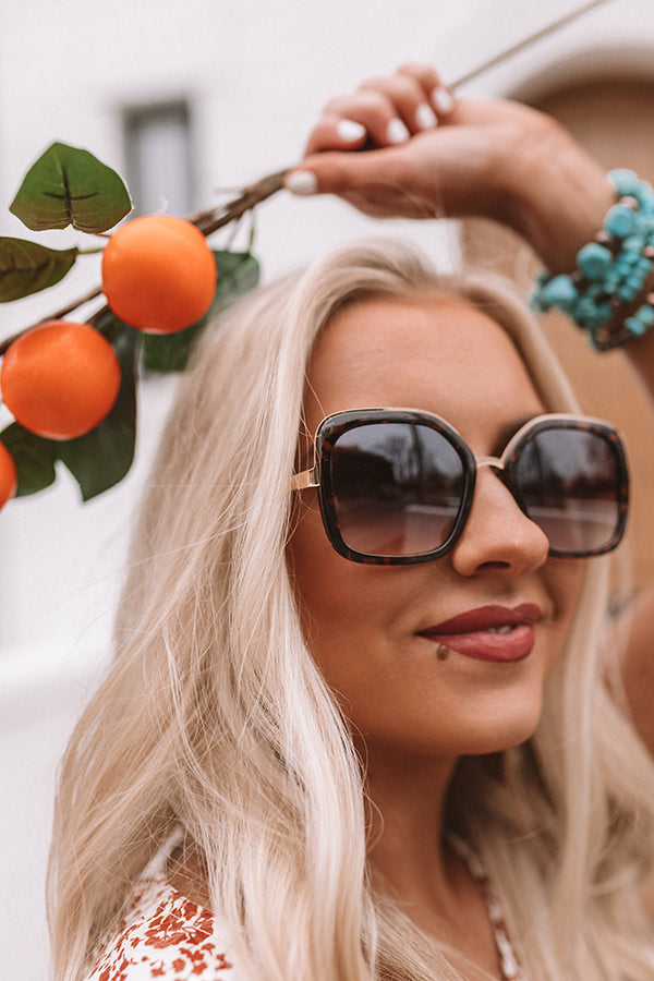 There is no better way to stay stylish while "sipping a cocktail in the shade" than by accessorizing with these adorable sunnies featuring square frames patterned with a maple colored tortoiseshell print, gold detailing on the nose bridge and ear pieces, and dark tinted lenses!
