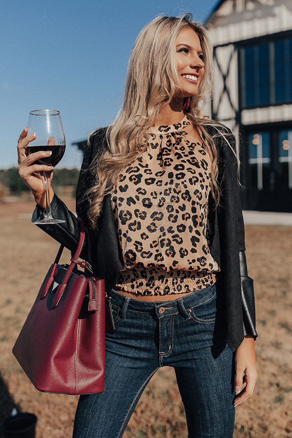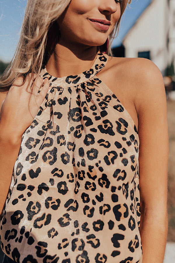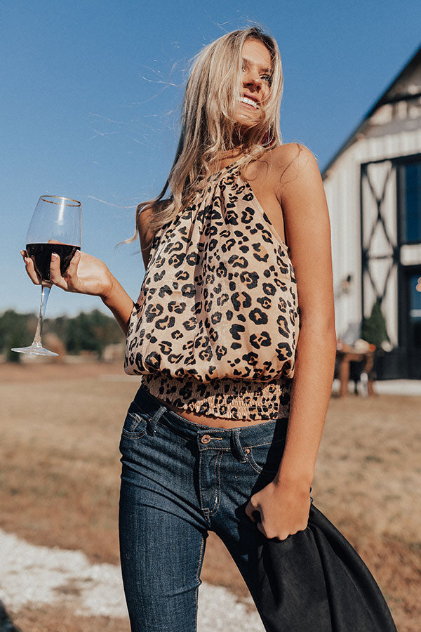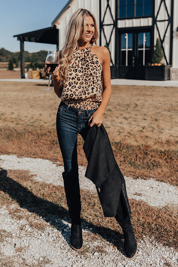 Stay looking chic white "sipping martinis" during happy hour with this adorable tank featuring sleek lightweight satin material patterned with a bold black and neutral hued leopard print, a high rounded halter neckline, a keyhole accented upper back with a button closure, and a relaxed silhouette that falls into an straight fitted smocked hemline! This flirty fall piece can be layered under a black jacket with some denim skinnies, over the knee boots, and a red tote, or it can be worn solo with some black flares, "The Jess Faux Leather Heel in Warm Taupe," and our "Evening Adventure Hat in Black!" Measurements