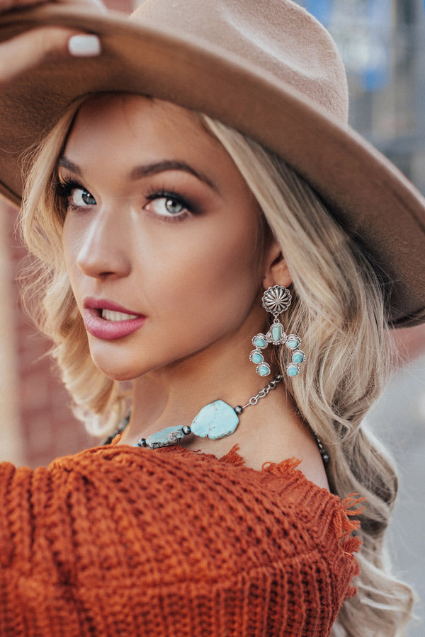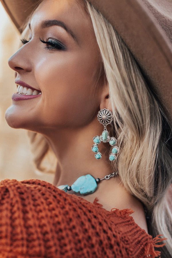 Stay looking amazing while "sipping martinis" by accessorizing with these statement earrings featuring silver flowering studs and large turquoise faux stone crescents!