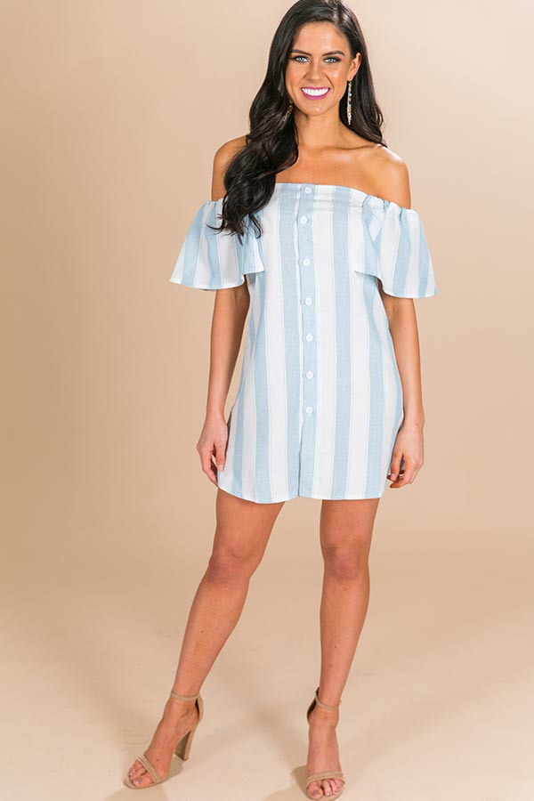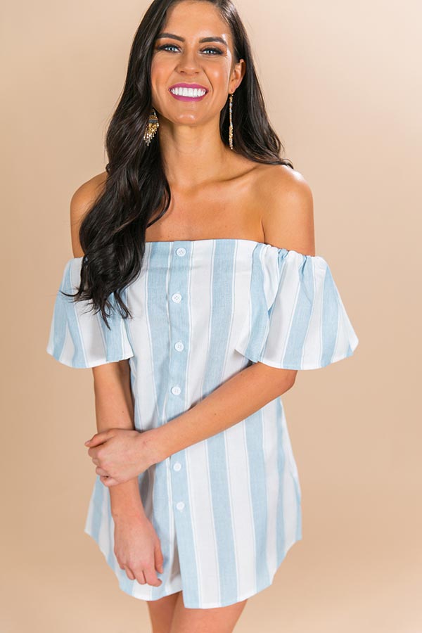 Sip mimosas seaside in this striped sweetie! This breezy beauty has an elasticized off-the-shoulder neckline, flirty flounce sleeves & a relaxed button-down silhouette. Style with your favorite sandals or wedges for a sweet Summer look that's ready for a walk down the boardwalk or brunch with your besties!