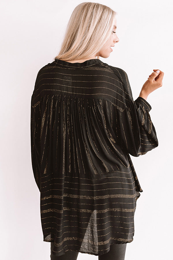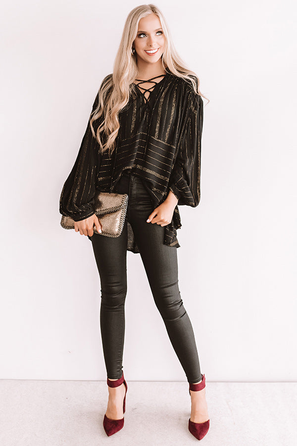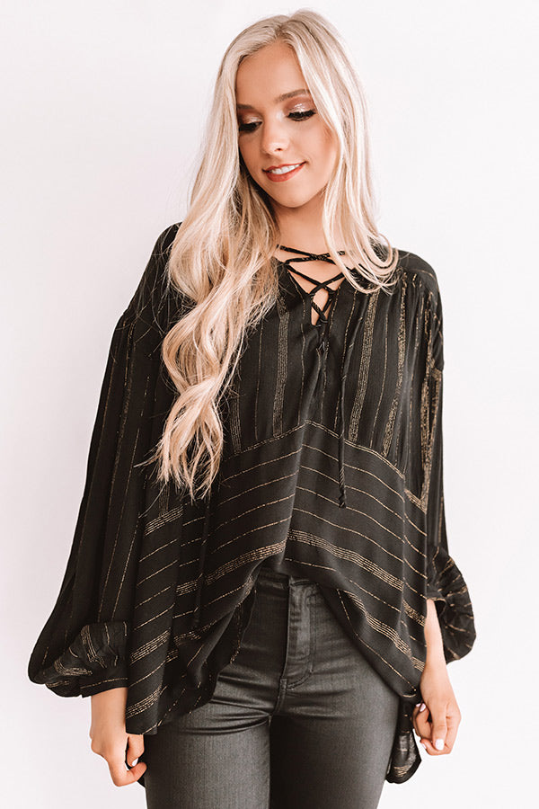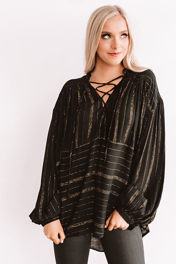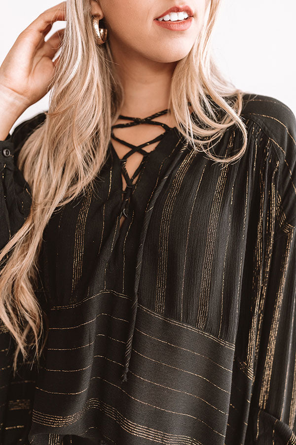 We guarantee you won't look better "sipping vino" in any other piece than this black shift top featuring a semi sheer lightweight material, shimmering gold stripe patterns, a v-cut neckline with a laced up closure, long oversized bishop sleeves with elastic banded cuffs, and an ultra relaxed silhouette that falls into a rounded tunic length hemline! This flirty transitional piece styles perfectly front tucked into some faux leather leggings, a glamorous clutch, and a merlot colored pump, or it can be dressed down with a distressed denim skirt, "The Delaney Sneaker in Gold," and "The Jonas Hat in Black!" Measurements