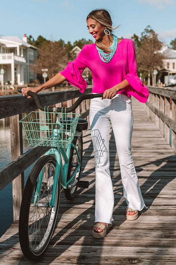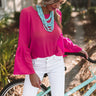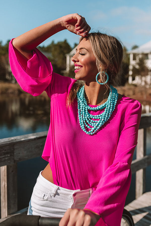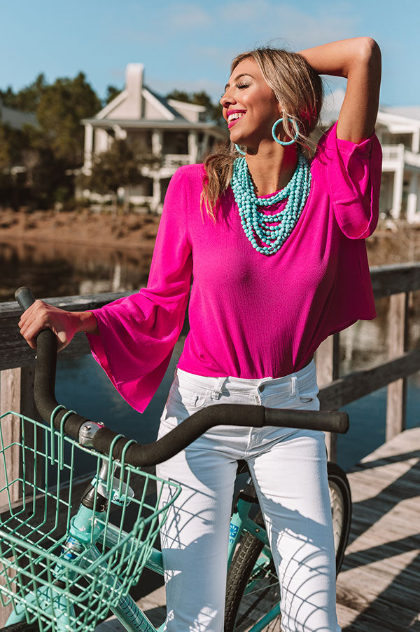 The "Sips And Swooning Shift Top" is the perfect mix of contemporary & chic! With bell sleeves & a light weight fabric this top features a scooped neckline, key hole buttoned back and a semi-cropped, relaxed bodice.