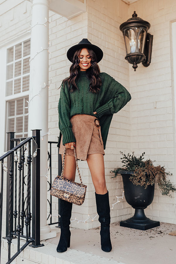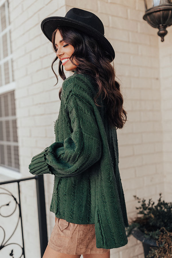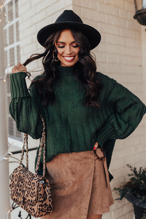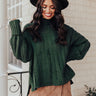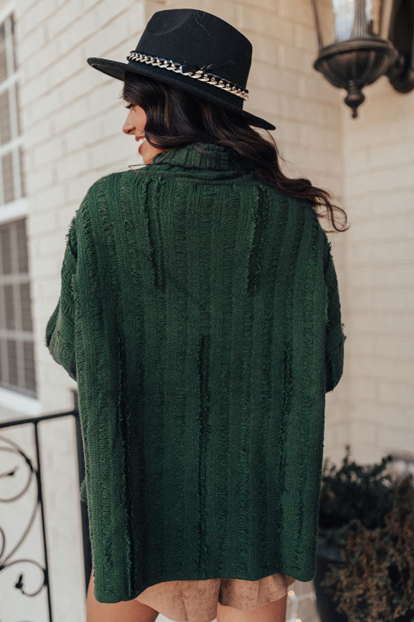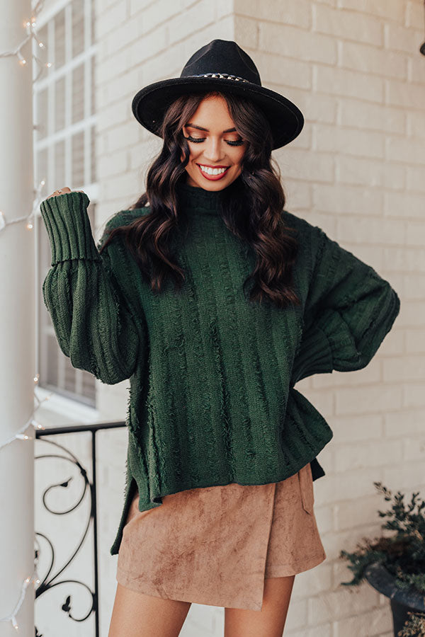 You will be a total babe when you wear this charming hunter green hued shift sweater featuring soft lightweight tight knit material with with wide ribbed texturing, a turtle neckline, long oversized sleeves with fitted rolled cuffs, subtle frayed detailing, and a relaxed silhouette that falls into a straight hemline with accent side slits! Measurements