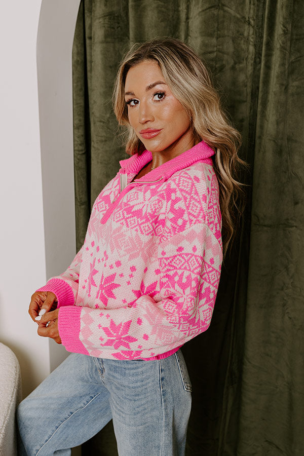 - Get ready to bundle up in style! This adorable knit pullover features a timeless snowflake-inspired design that adds a sweet touch of cozy charm to your seasonal wardrobe. Perfect for layering or wearing on its own, it brings warmth and whimsy to chilly days while keeping your look effortlessly stylish. - Unlined knit material with an intricate design with abstract snowflakes - Featuring cream, and different pink hues - A mock neckline that unzips into a quarter zipped bodice - Long sleeves with ribbed cuffs - A relaxed silhouette that ends in a straight hemline with a ribbed texture