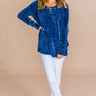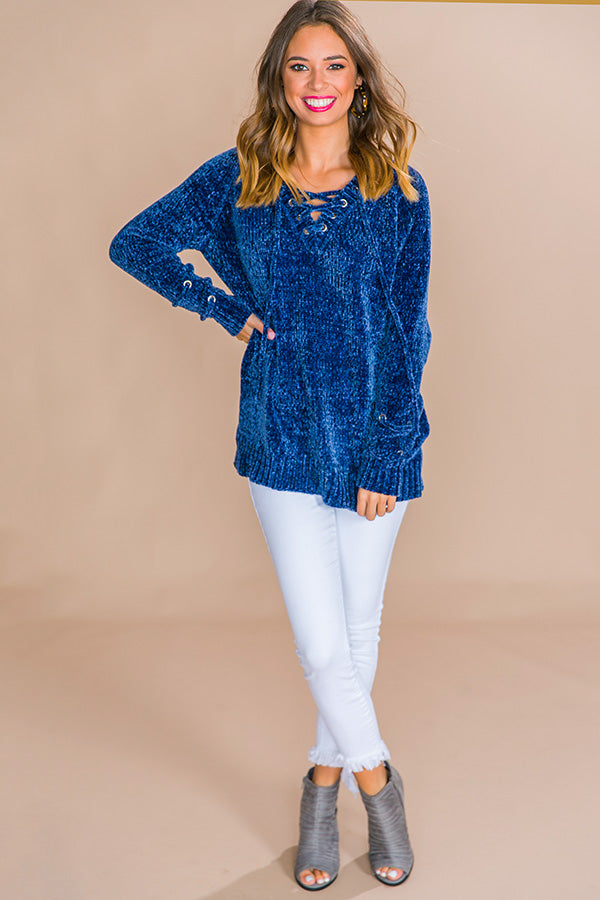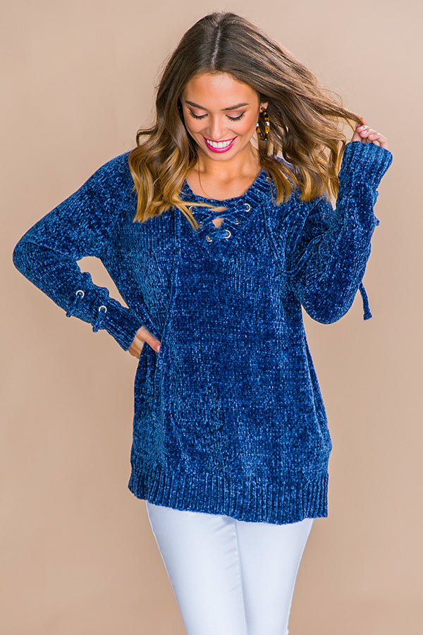 Ski Lodge Kisses Lace Up Chenille Sweater in Cobalt