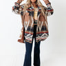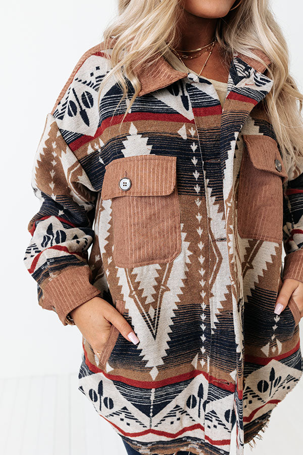 Our fave outerwear piece just dropped! Our stunning 'Skiing In Breckenridge Jacket' features warm material patterned with an intricate rust, navy, white, and tan aztec print, a button down front with a collared neckline, long loose sleeves with button closure cuffs, two chest pockets with flap closures, and a relaxed silhouette that falls into a rounded hemline! Measurements