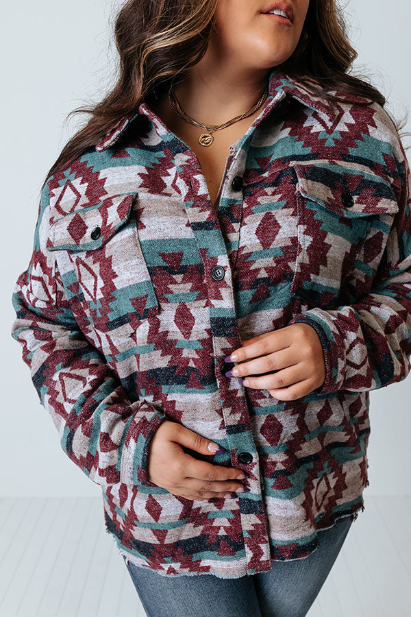 Add a colorful touch to your fall wardrobe with our cute plus size 'Skiing In Sun Valley Jacket' featuring warm material patterned with a dark berry, light natural, and turquoise aztec print, a button down front with a collared neckline, long loose sleeve with button closure cuffs, two chest pockets with flap closures, and a relaxed silhouette that falls into a rounded hemline! Measurements