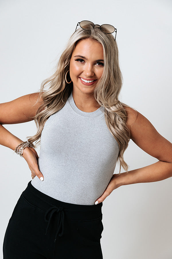 Hit the city limits in style with our trendy grey 'Skip Town' bodysuit featuring lightweight and stretchy seamless material, a high rounded neckline, wide sleeveless shoulders, and a flattering form fitting silhouette that ends in cheeky fit bottoms with a snap button closure! Measurements