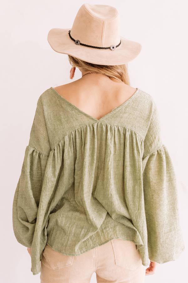 Stay looking stylish while "skippin' down Sixteenth Avenue" with this pear colored top featuring a lightweight material, a wide v-cut neckline and upper back, long loose bubble sleeves with elastic banded cuffs, and an ultra relaxed babydoll silhouette that falls into a straight hemline! Measurements