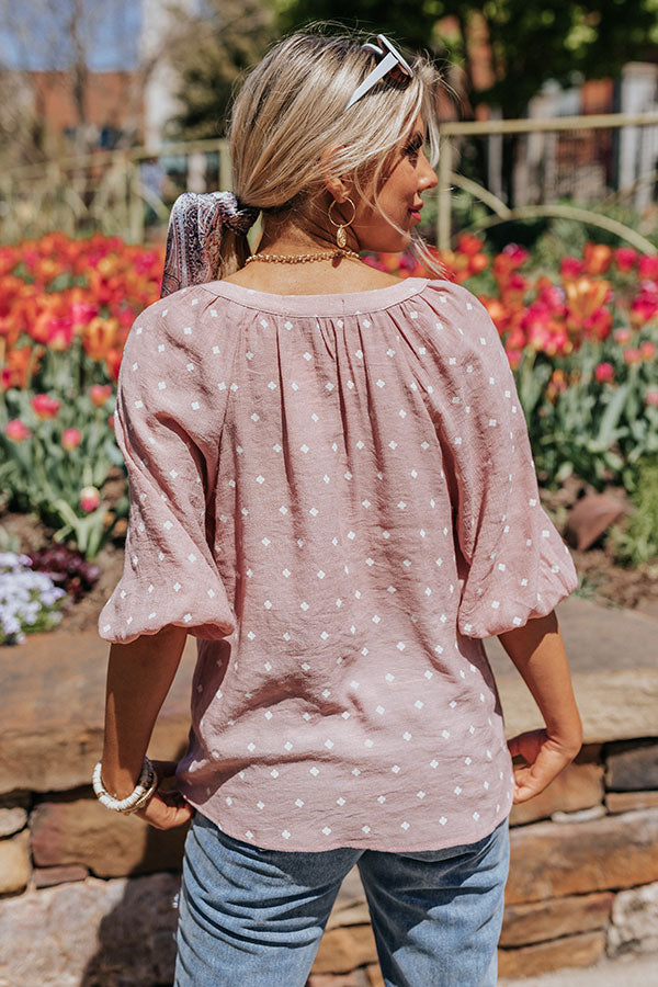 Achieve all your sky high ambitions looking amazing with this chic blush hued shift top featuring lightweight flowy material patterned with small white diamonds, a v-cut neckline, bubble half sleeves, and a relaxed silhouette that falls into a rounded hemline! Measurements