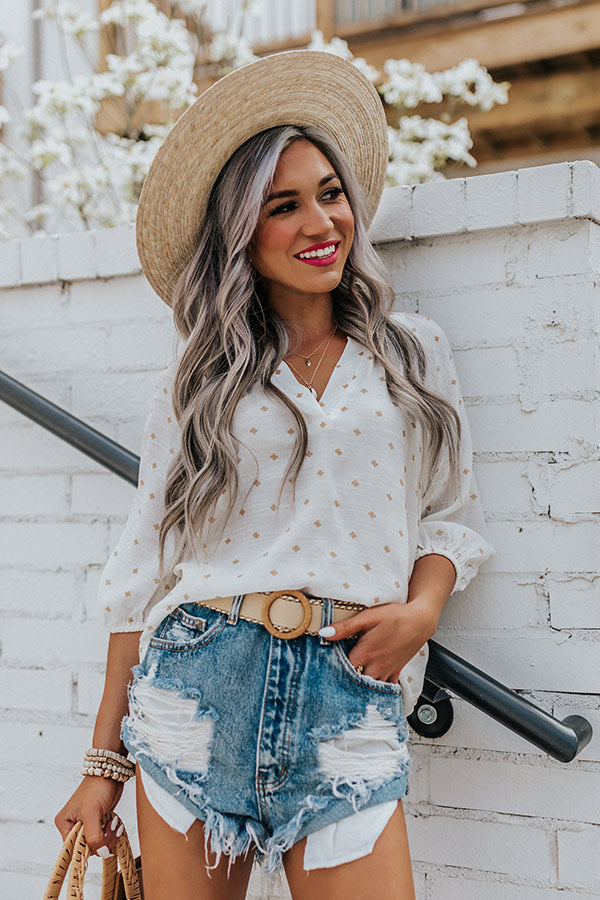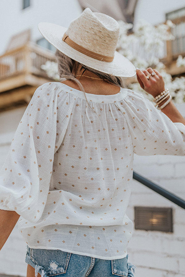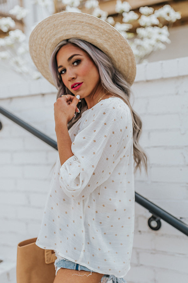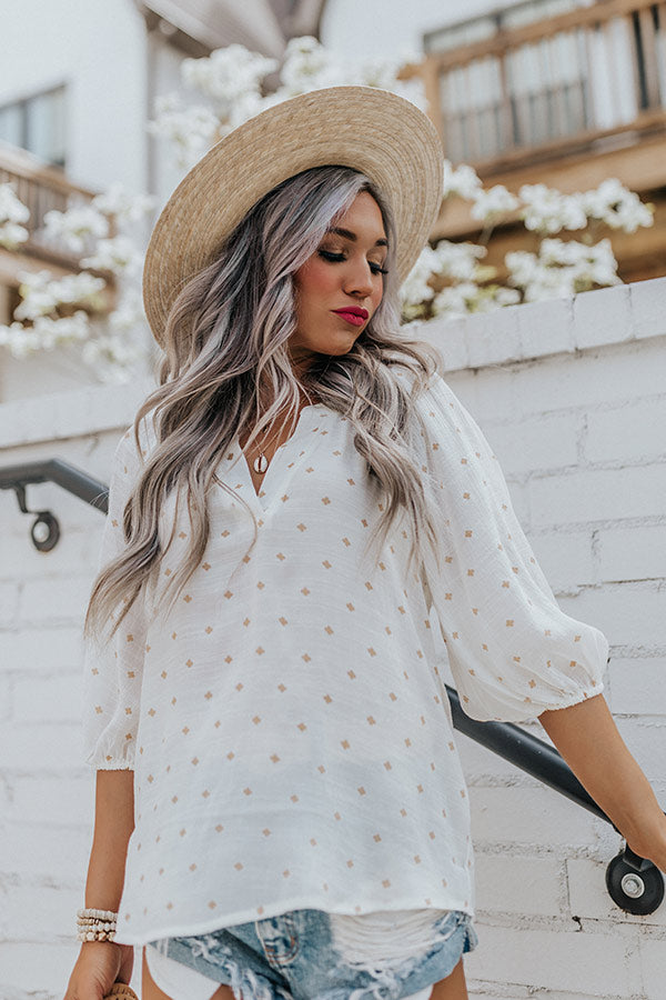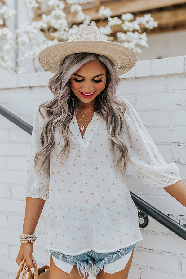 Achieve all your sky high ambitions looking amazing with this chic white shift top featuring lightweight flowy material patterned with small gold diamonds, a v-cut neckline, bubble half sleeves, and a relaxed silhouette that falls into a rounded hemline! Measurements
