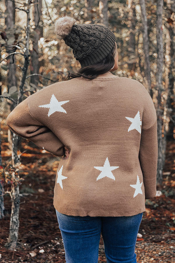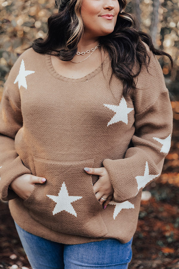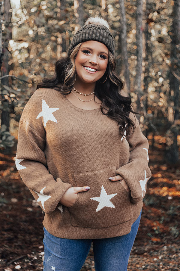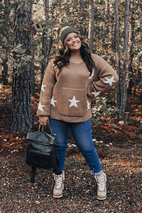 Shine bright in our darling plus size mocha hued 'Skylight' sweater featuring soft knit material patterned with white stars, a rounded neckline, long loose sleeves with fitted cuffs, a large kangaroo front pouch, and a slouched silhouette that falls into a straight hemline with accent side slits!