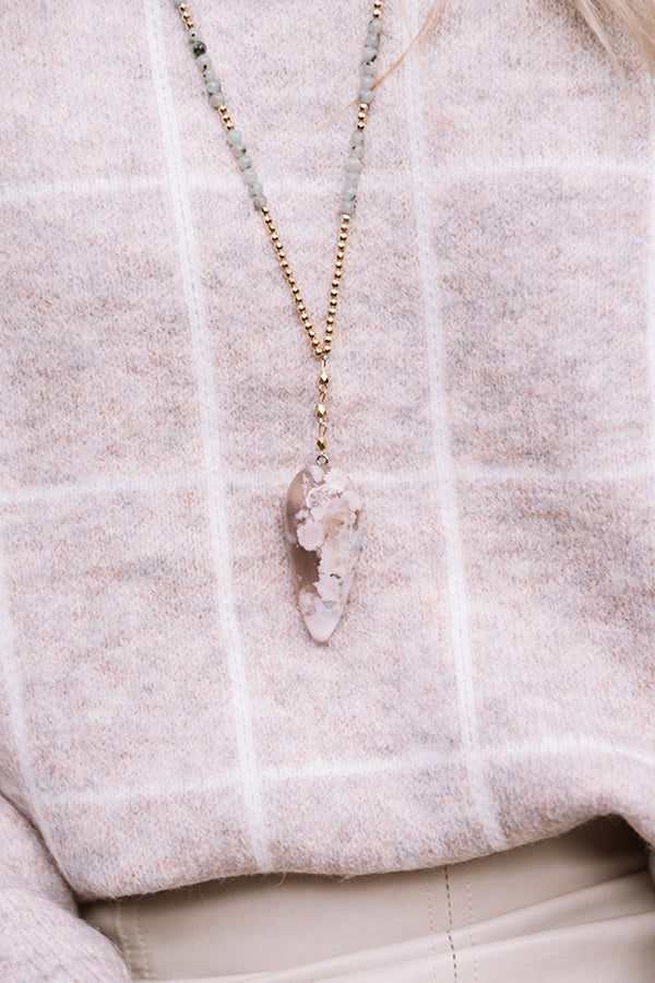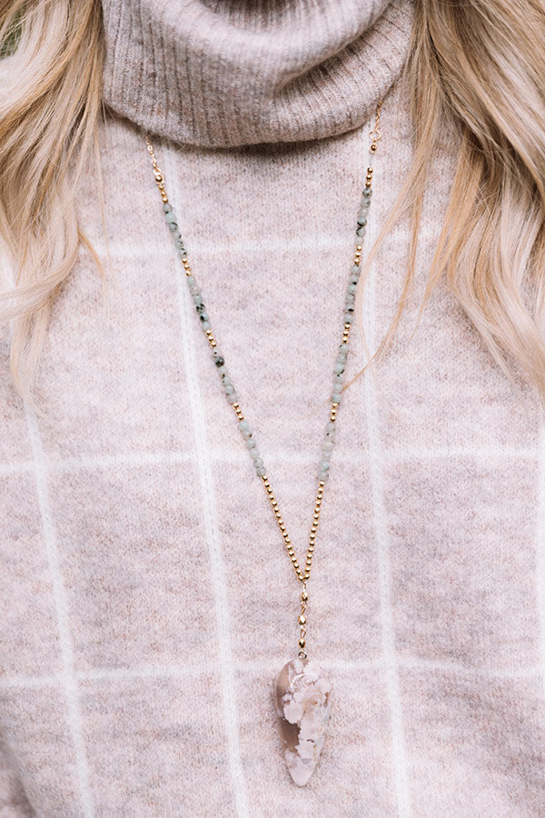 Don't hesitate to add this beauty to your cart! This stunning necklace features a long gold chain with taupe beaded detailing and a large pointed taupe colored semi precious stone pendant!