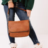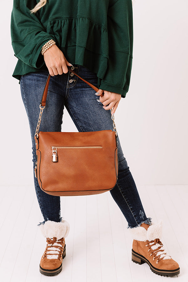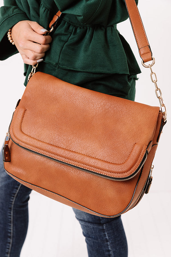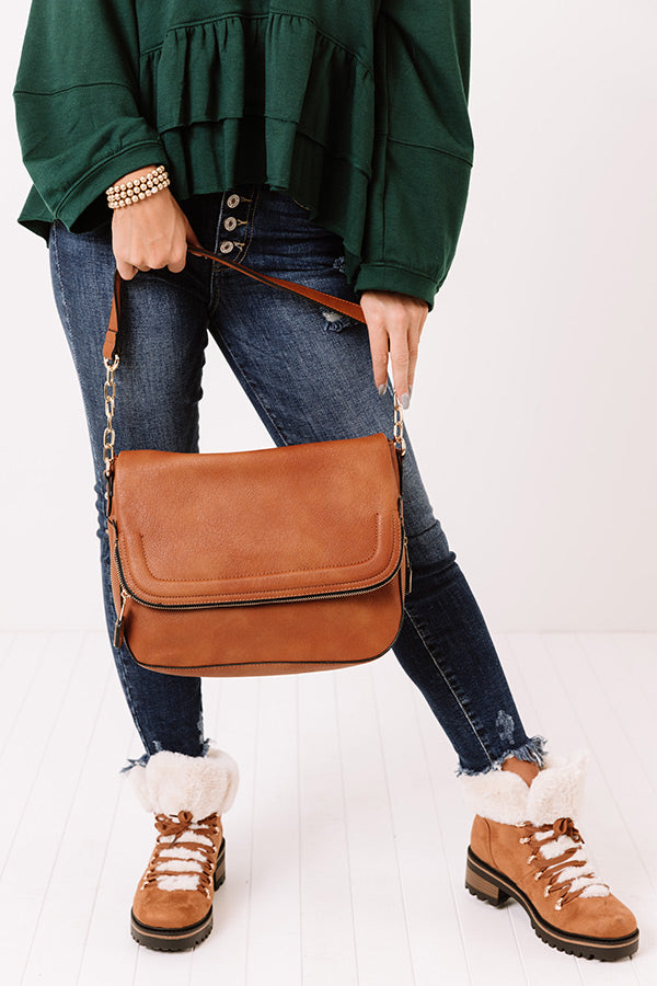You are sure to look sleek and chic when you accessorize with this luxe maple colored crossbody featuring lightweight faux leather material, a removable and adjustable shoulder strap, an extra outside pocket on the back, a flap with a zip closure and connecting snap, and a spacious pouch with additional inside pockets!