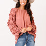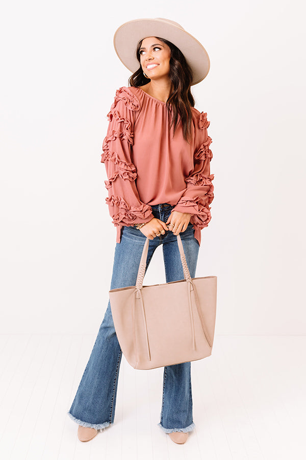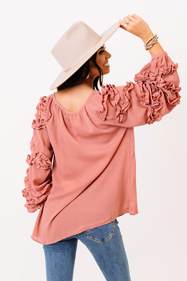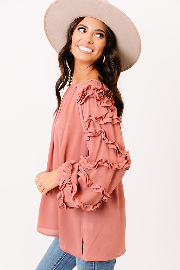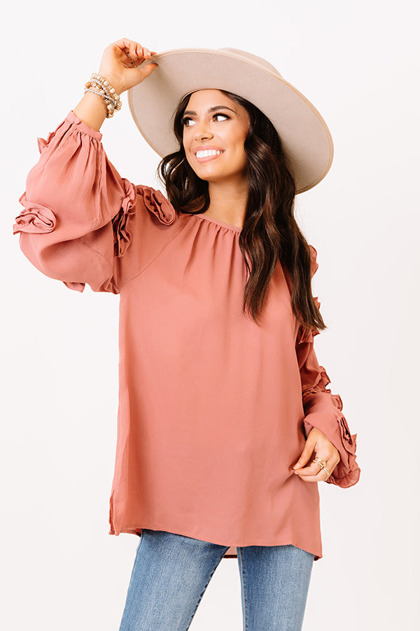 You are guaranteed to look like a sleek socialite when you wear this gorgeous dark teal colored shift top featuring lightweight flowy material, a high rounded neckline, long loos sleeves with oversized ruffle stripe detailing and fitted button closure cuffs, and a relaxed silhouette that falls into a straight hemline with accent side slits!
