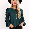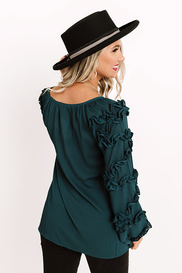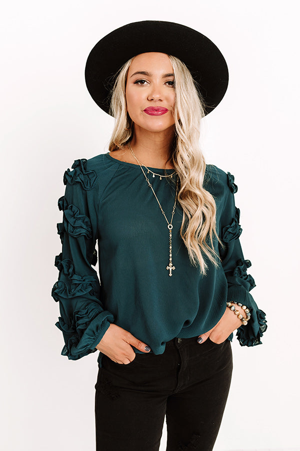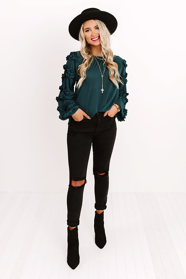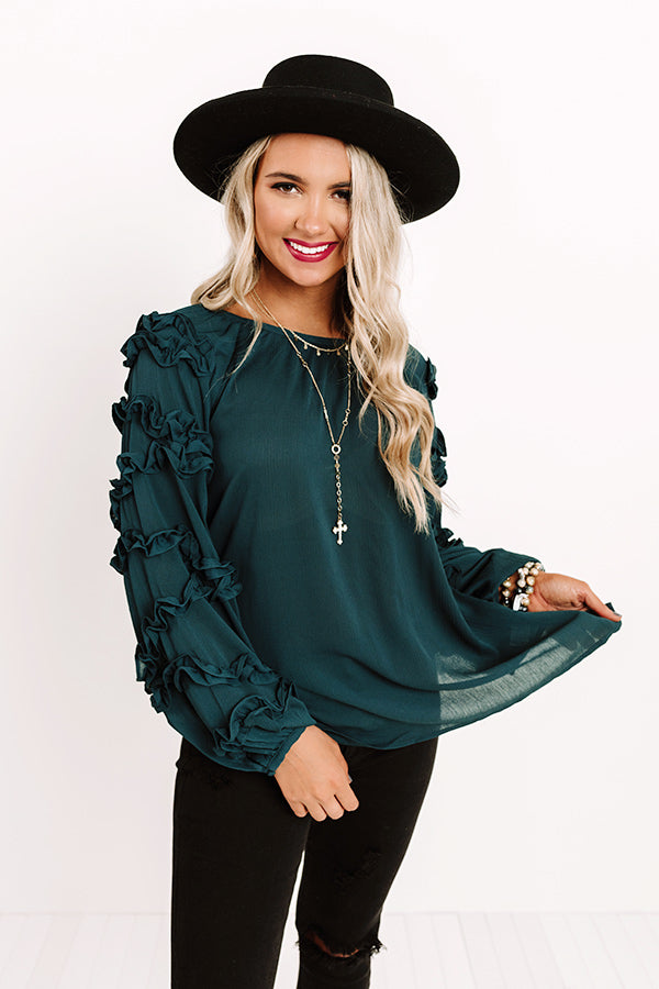 You are guaranteed to look like a sleek socialite when you wear this gorgeous dark teal colored shift top featuring lightweight flowy material, a high rounded neckline, long loos sleeves with oversized ruffle stripe detailing and fitted button closure cuffs, and a relaxed silhouette that falls into a straight hemline with accent side slits! Measurements