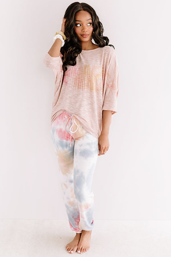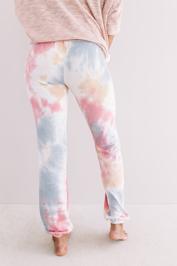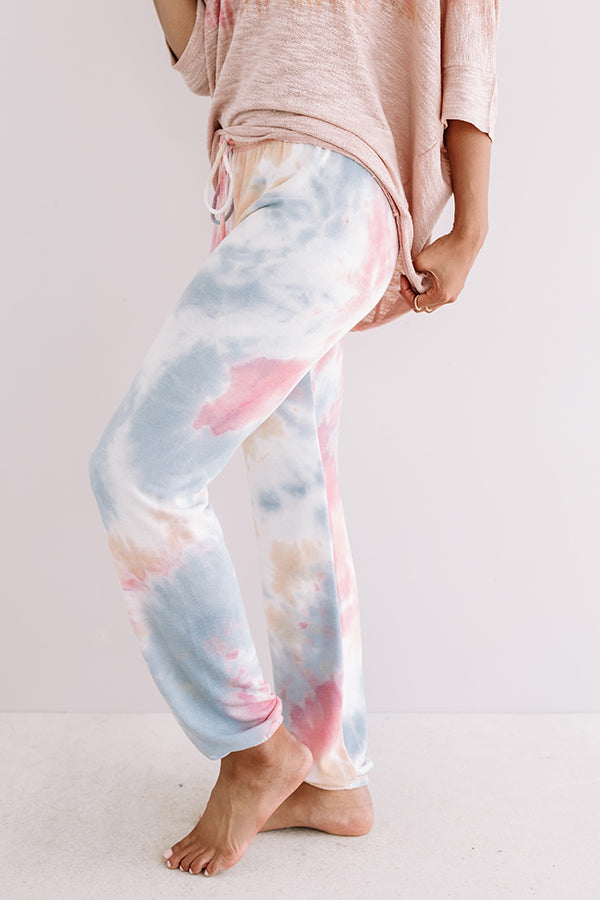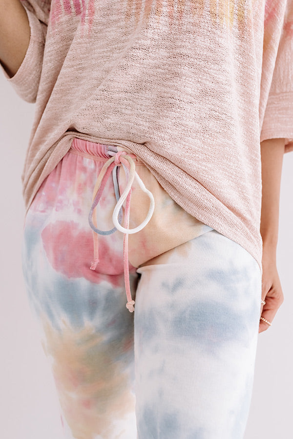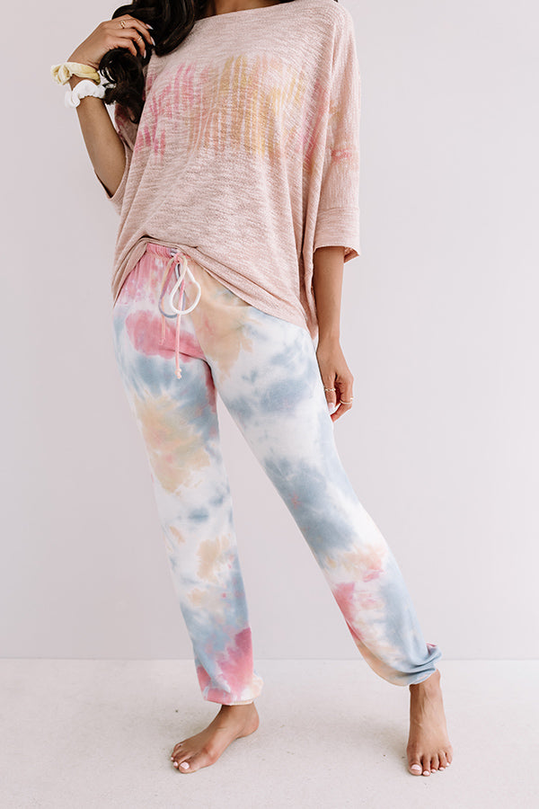 You won't want to wear any other piece when "sleeping in" than these cozy joggers featuring soft lightweight material patterned with blue, pink, and yellow hued tie dye, an elastic waistline with a tie belt, and a relaxed pants silhouette that falls into fitted ankle-length hemlines! This comfy piece styles perfectly with a matching top, scrunchie, and fuzzy slippers for the ultimate two-piece lounge look! Measurements